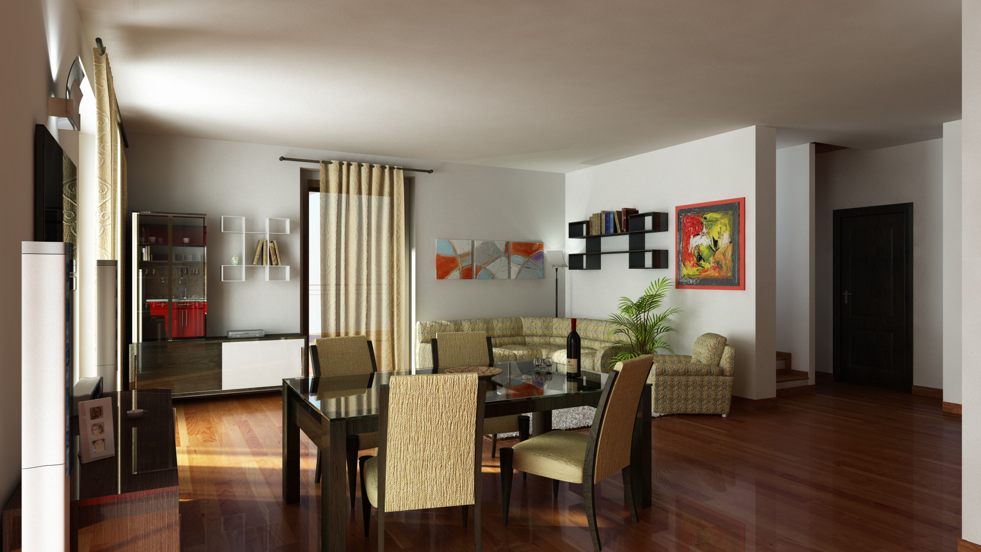 nuova visuale... c'è qualche sbaglio come il bump delle sedie troppo elevato.. poi non mi piace il mobile che riflette la cucina.. confonde un po le idee...