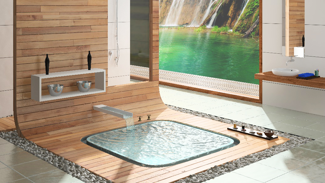 cambierei l'immagine esterna,levando quella sedia che disturba,nello stesso tempo appare molto strana,sembra incollata in post.Per le piastrelle del pavimento non si capisce bene di cosa siano,per le doghe in legno eviterei che siano lucide,immagina un teak come le barche e vedrai che ci stà meglio.L'acqua che scende dal rubinetto,è troppo bianca falla + trasparente.Queste sono le cose che momentaneamente noto.per il resto mi sembra buono.Hai fatto i sassi :shock: :lol: :lol: belli belli