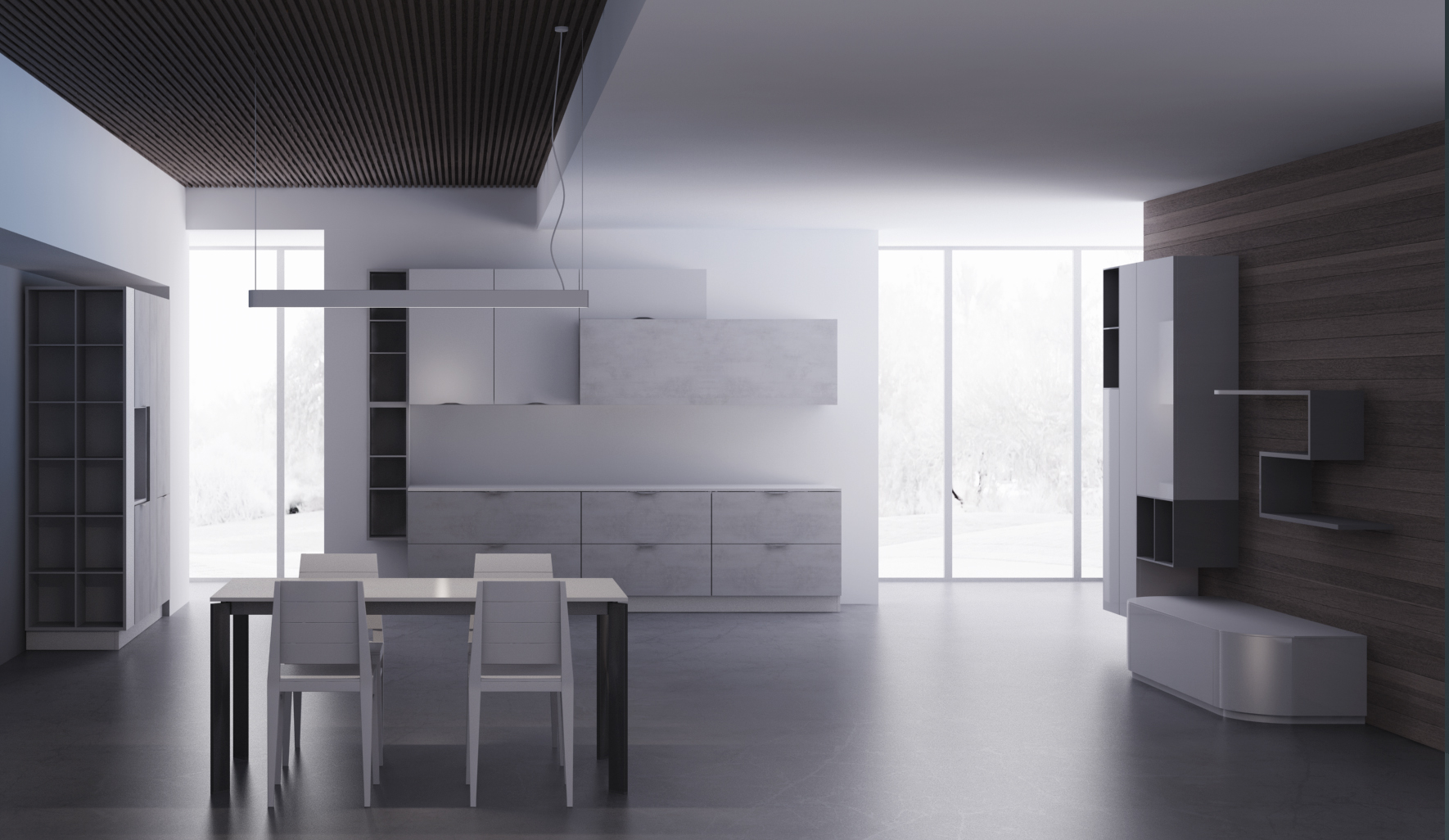 A parte l'inquinamento del pavimento sul soffitto della tua immagine,ho notato anche io che l'utilizzo dell'hdr ha bisogno poi di un appoggio ,anche se ho dubbi visto l'esposizione esterna a mio parere la stanza interna dovrebbe essere + luminosa,prendendo luce di rimbalzo dal muro di retro,come a mio avviso nelle realtà,ma se forzi l'hdr quel soffitto in alto a dx brucia.non vedo una proporzione di luce che entra con quella che si diffonde.Sicuramente con le area hai un maggior controllo,ho fatto una prova anche io con area e hdr in rendering d'uscita.Le area rimbalzano sul muro di retro restituendo a sua volta luce,e non lo trovo sbagliato.Sono venuto ad una conclusione che devi scegliere un hdr per ogni scena,oppure se il tuo stand è simile usi la stessa.Posto le due immagini quella con le area sono 2 frontali,il lampadario acceso sul tavolo,e luci senza diffuse come specchiate.L'hdr solo hdr,+ specchiate e luce tavolo,vorrei desaturare lhdr per evitare l'azzurro ma ho voluto provare così.In attesa di consigli di persone più esperte.Devo anche capire come mai quel bianco in alto a dx del soffitto in legno,non capisco come possa proseguire in verticale del massetto,dorebbe essere scuro.Non guardate l'esposizione dell'esterno non è secondo me corretta con l'interno(è un pannello con un immagine),poi comunque andrà cambiata in fase di lavoro.
