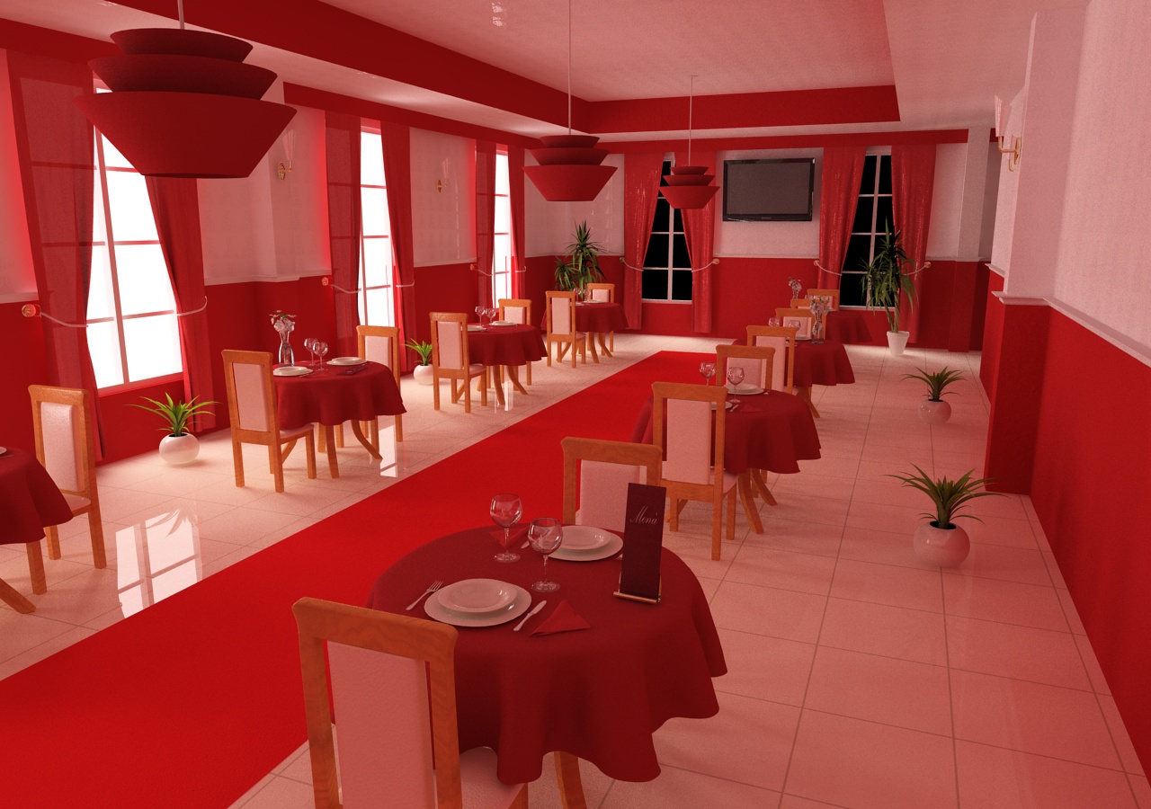 eccomi qua,allora...i modelli che vedete di piante li ho presi in rete...di questo rendering mi piace molto la resa di alcuni materiali come i tessuti,mentre ho sbagliato il bianco delle lampade...non capisco perche siano uscite cosi le tende frontali,con tutti quei puntini bianchi ecc...come avrete notato ho aggiunto anche il tv insieme ai menu sui tavoli,e che non ho duplicato in serie,ma li ho messi tutti in posizioni diverse e non sono in tutti i tavoli...poi ho anche notato che l immagine rimane ancora un po troppo rossa,forse dall eccessiva riflessione della carta da parati,e ho visto che cambiando da photoshop il bilanciamento colore del rosso,portandolo al cyan(il colore opposto)l immagine migliora abbastanza,proprio da li ho notato che e troppo rossa...se non correggo con la riflessione della carta da parati,credo che dovrò modificare il white balance