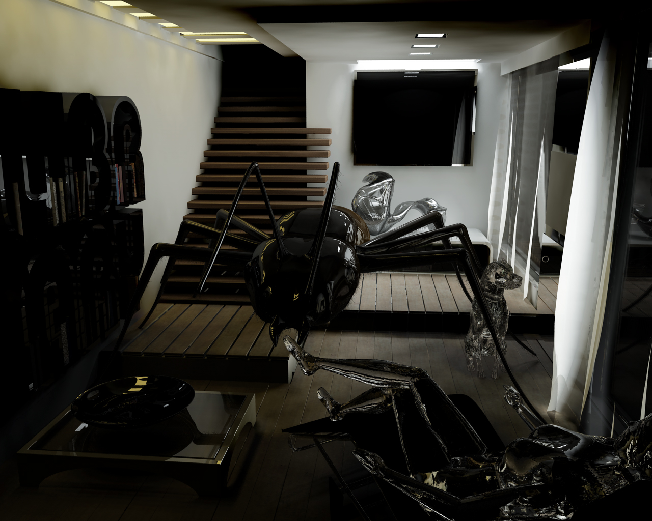-i riflessi che si vedevano nel mobile in primo piano erano dovuti al fatto che alle ante di apertura avevo messo un materiale che in teoria doveva essere un vetro,e proprio lì andava a cozzare un pò di luce proveniente dal finestrone difronte!! nel render che ho inserito ora ,il mobile è monomaterico(poi in seguito risolverò anche quello di dilemma)!