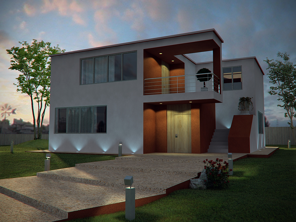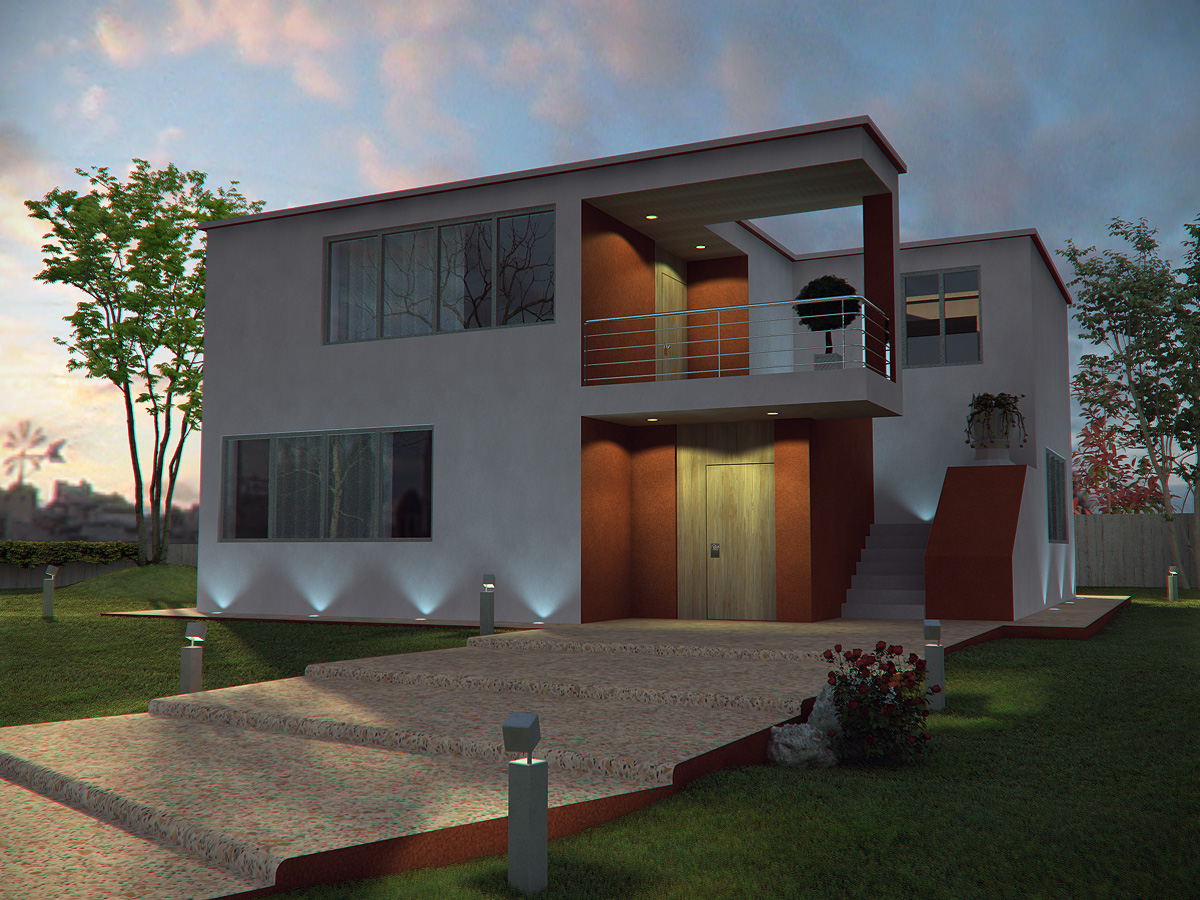 Ciao,.. mi sbaglio, non c'è piu il sole?.. è solo HDRI ?.. a me piace come è illuminato. Un parere molto, ma molto, ma molto personale.. le luci del giardino (come forma dei corpi illuminanti) e il bordo marrone dei gradini e marciapiede, non mi convicono molto...ma e solo gusto.