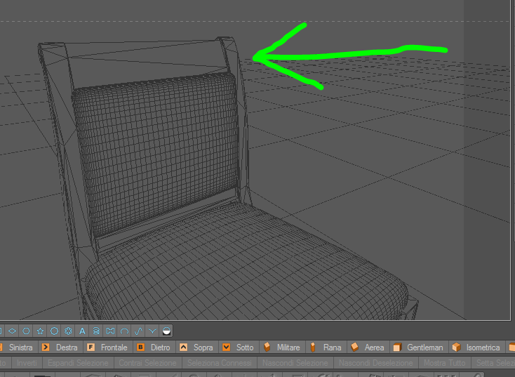 che serve per verificare eventuali problemi sulle mesh, è molto utile perchè seleziona automaticamente poligoni, vertici o lati che presentano errori e te li segnala nella console di cinema; se lo usi sulla mesh dello schienale, non vedrai niente selezionato perchè tutti gli errori segnalati si concentrano in un unico punto, ma tu fai comunque Cancella. Vedrai che così non avrai problemi con il proxy.