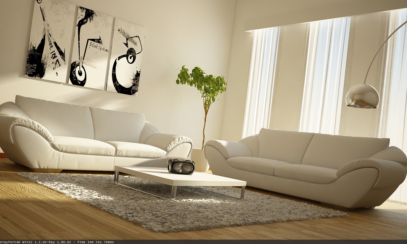 adesso l'immagine è un pelo scura, che CM stai usando? potresti aumentare un po' l'intensità della luce che proietta le ombre sul quadro, da farle fare x bene anche dei divani sul pavimento.anche il parquet secondo me ha bisogno di un re-stylingo una texture cn più definizione o una sistemata al materiale, forse un pelo di riflessione, ma quello dipende dal tipo di legno che vuoi