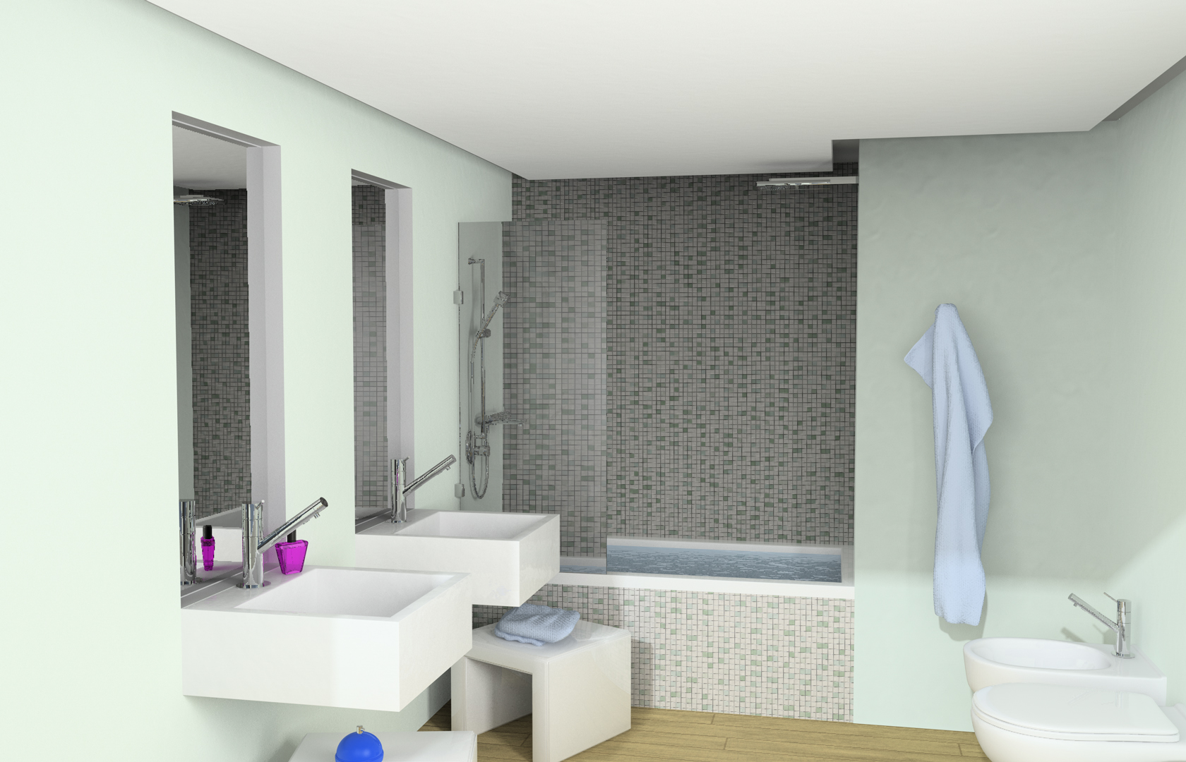 Le ombre dove sono? Se la luce entra da una finestra o porta-finestra allora la scena è, come dire, troppo illuminata. Le ombre sono talmente labili che non creano il necessario contrasto. La doccia sullo sfondo dovrebbe essere più in ombra. Probabilmente il tutto è dovuto al fatto che hai usato, secondo me, troppe fonti luminose. Bastarebbe, come primo test, una sola Sun Light e casomai poi provare ad inserire solo dopo altre fonti luminose.............