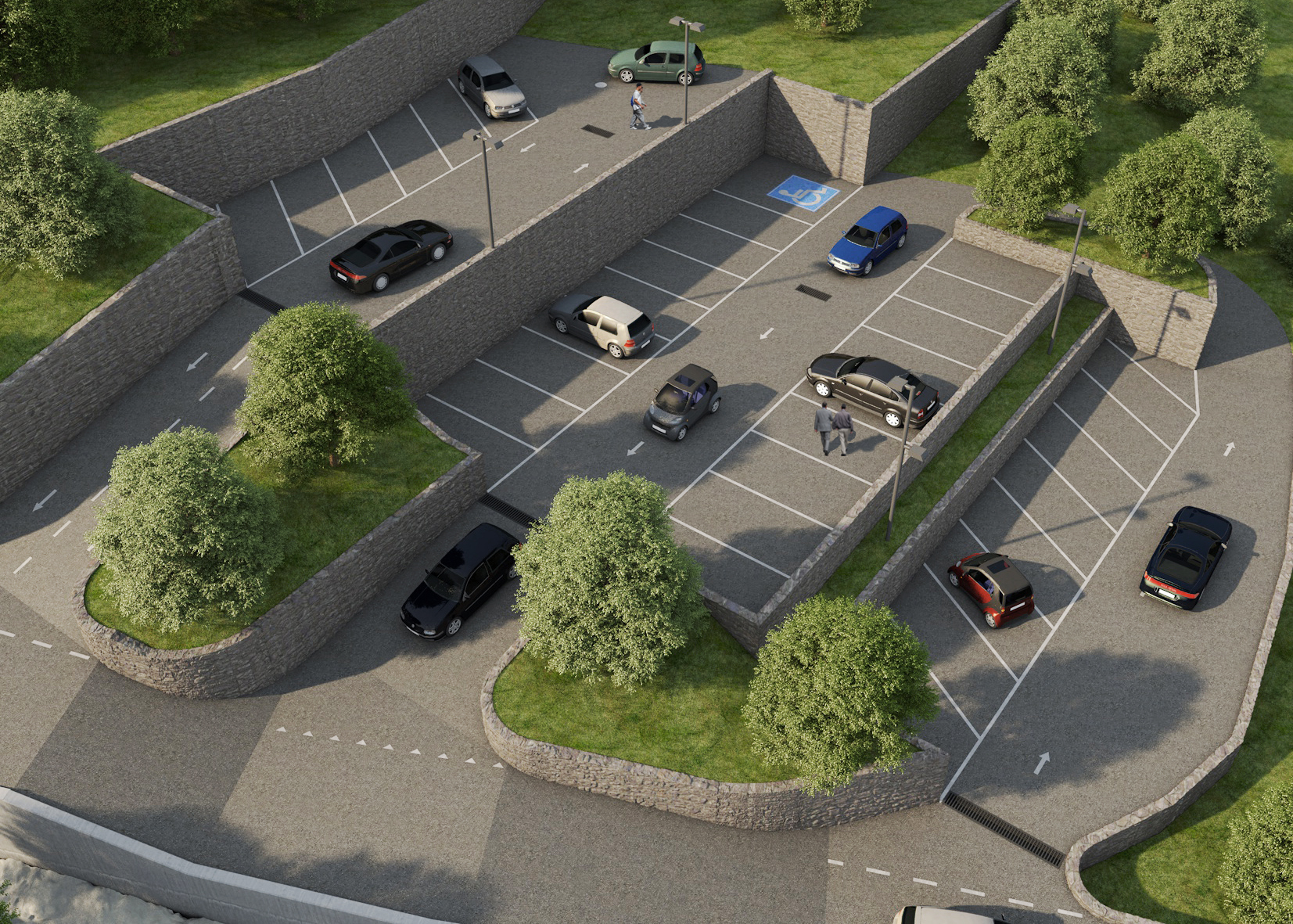 credo che ti sia sfuggito" l'ammorbidire" con Ps i cambi di pendenza nella strada di accesso ai parcheggi... se ne hai ancora "voglia" potresti ammorbidire le teste dei muri(magari inserendo del verede che scende)...