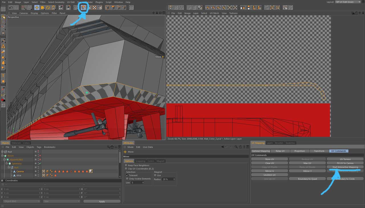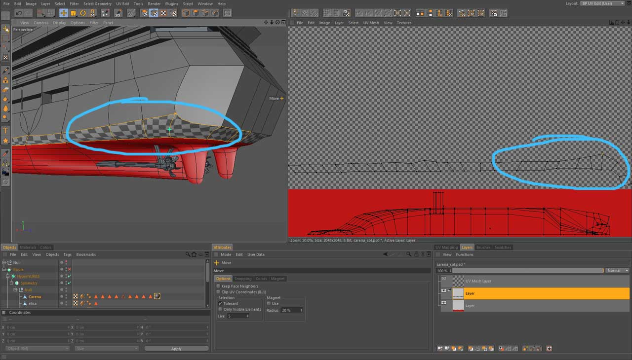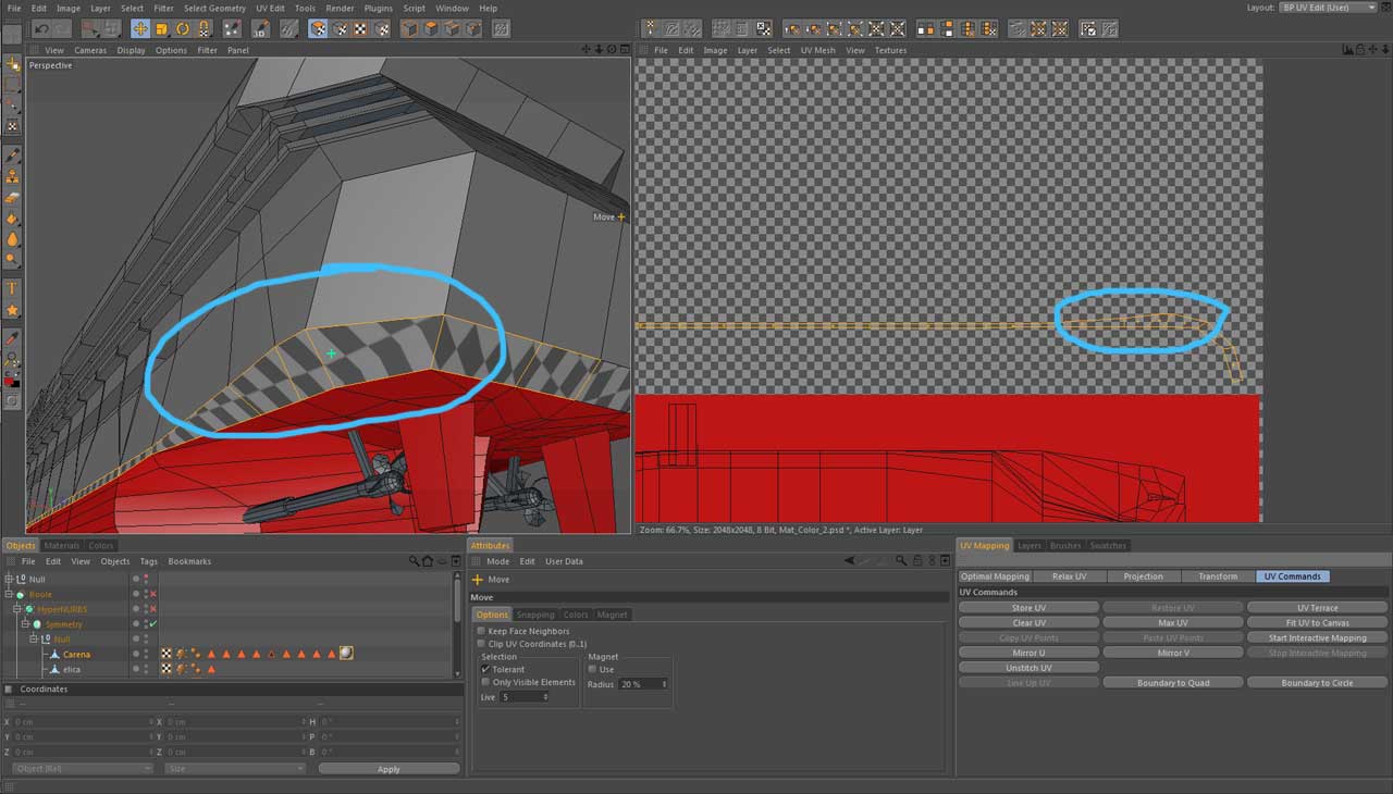 Dopo aver effettuato la proiezione tramite "start interactive mapping" sui poligoni selezionati (img02), ho manipolato l'UVmap cercando di stenderla senza troppe distorsioni. Le distorsioni sono facilmente individuabili se si utilizzata una texture vuota: quest'ultima infatti proietterà molti quadratini sul modello. Dove i quadrati arrivano troppo distorti (img 03) è il caso di intervenire raddrizzandoli (img04). Nel mio caso sono leggermente schiacciati verticalmente: non è un caso, ho fatto così in modo da avere più definizione verticale (più pixel). Questo riduce sgrani vari sulla linea (che purtroppo non è perfettamente dritta).