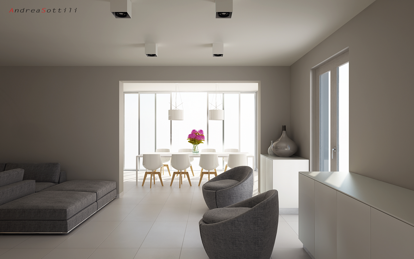 Per questa ambientazione e per velocizzare i tempi mi era stato richiesto di rappresentare solamente i "volumi" e mantenere il tutto poco vissuto e senza ornamenti... io adoro gli ambienti puliti e vuoti :oops: ma troppo vuoti poi è un esagerazione e quindi ho aggiunto un qualche piccolo ornamento... :) Sulla credenza a destra avrei voluto posizionare una composizione di quadri ma non sono riuscito a trovare delle foto che mi soddisfacessero e quindi ho evitato... :@