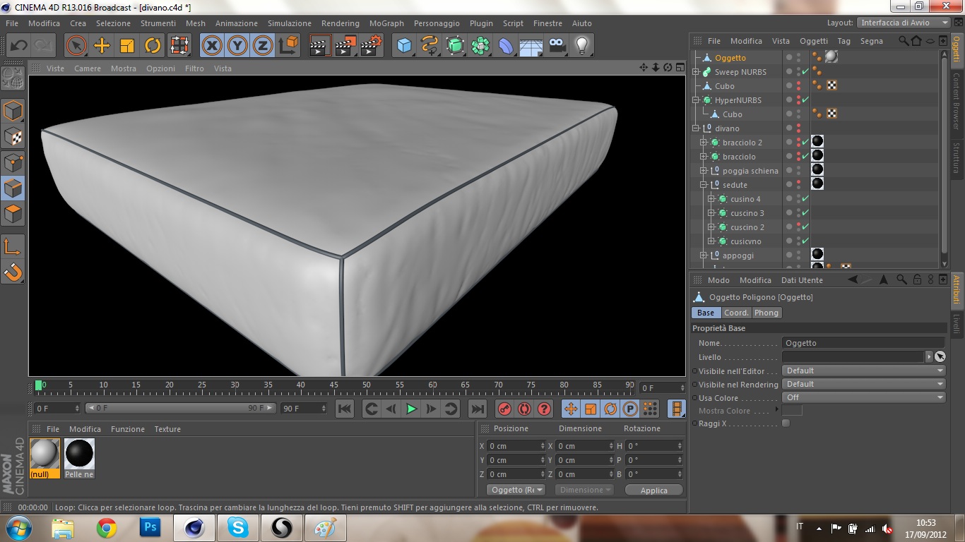 finiti i cuscini, ora qualche problemino ce l'ho con le cuciture, avendo appunto il cuscino suddiviso in triangoli, non riesco più a selezionare il percorso per la spline, ma credo che rendendo editabile la sweep nurbs ed usando un po' il magnete riesca ad adattare la cucitura nei punti un po' più critici.
