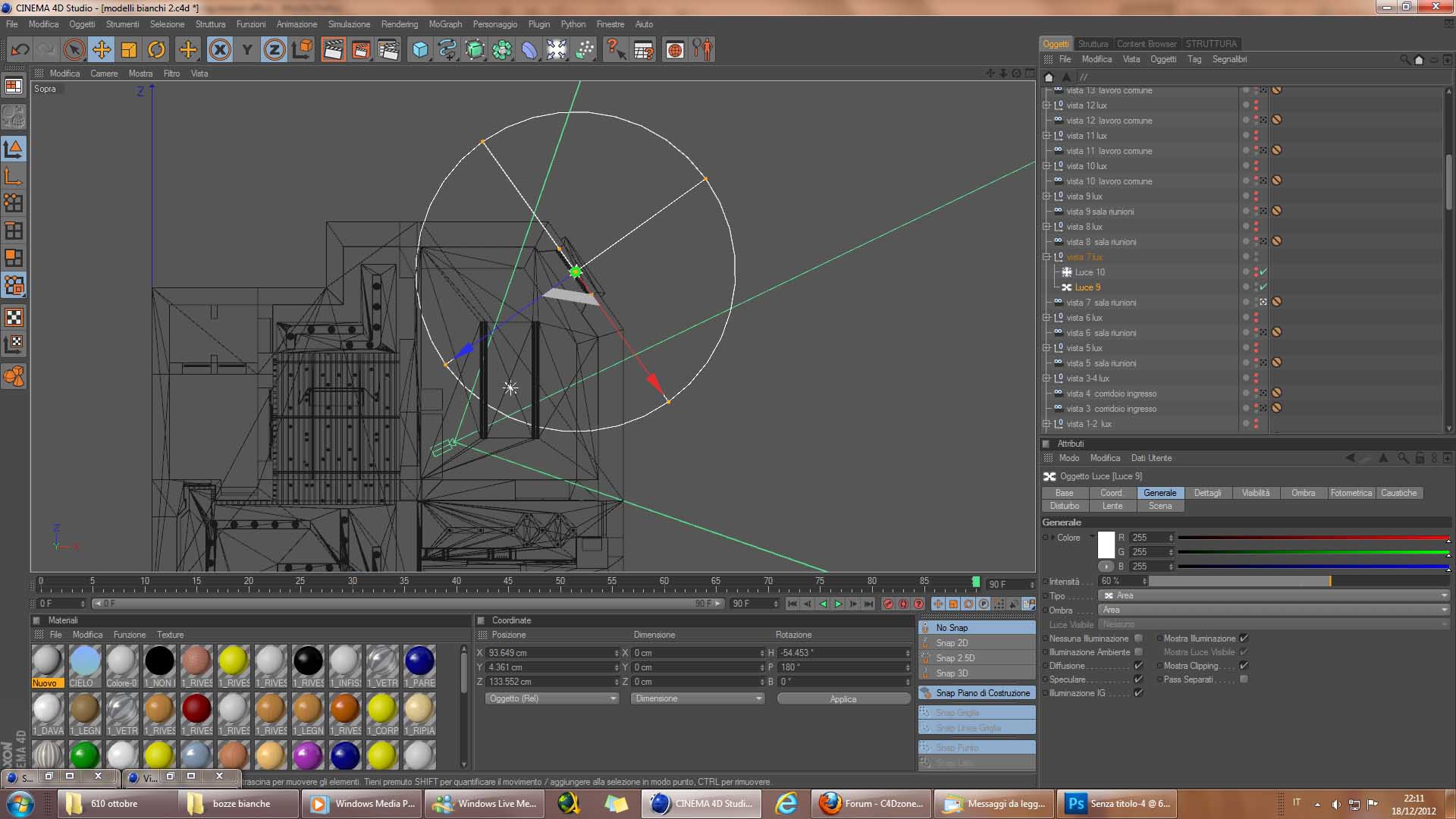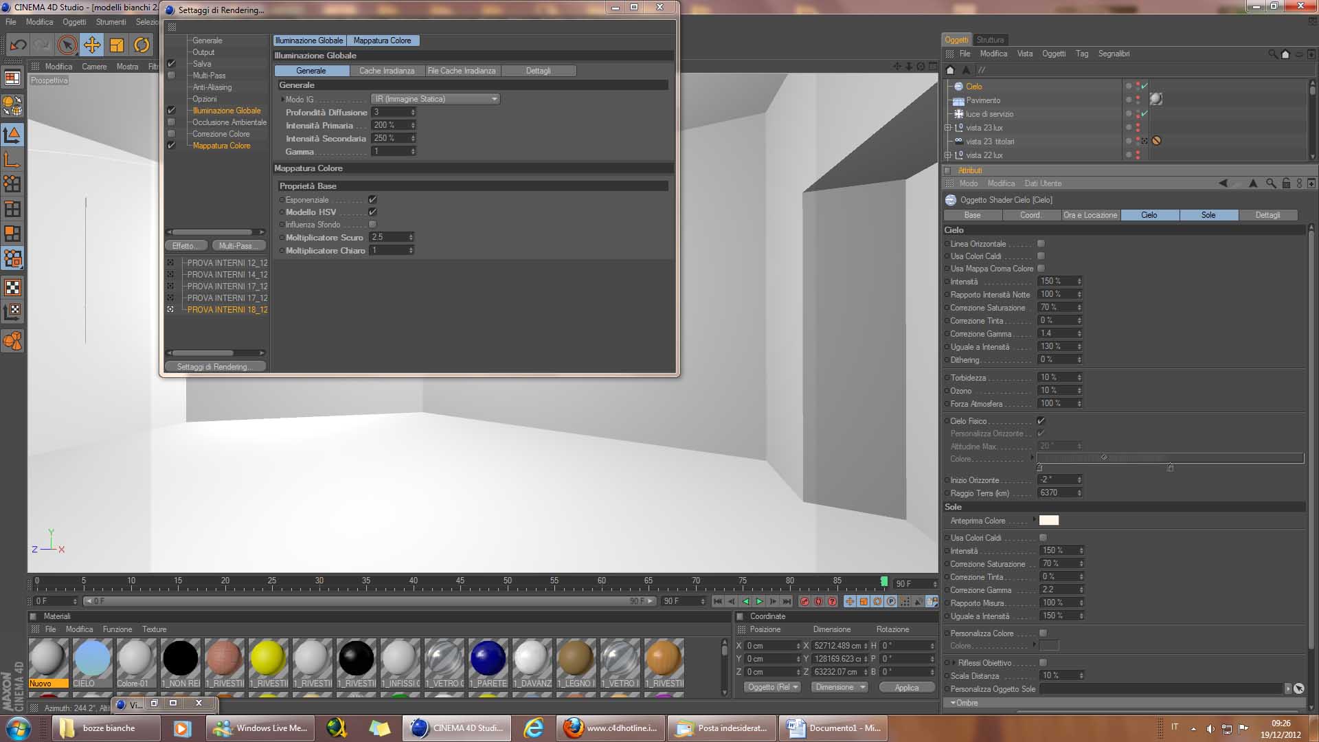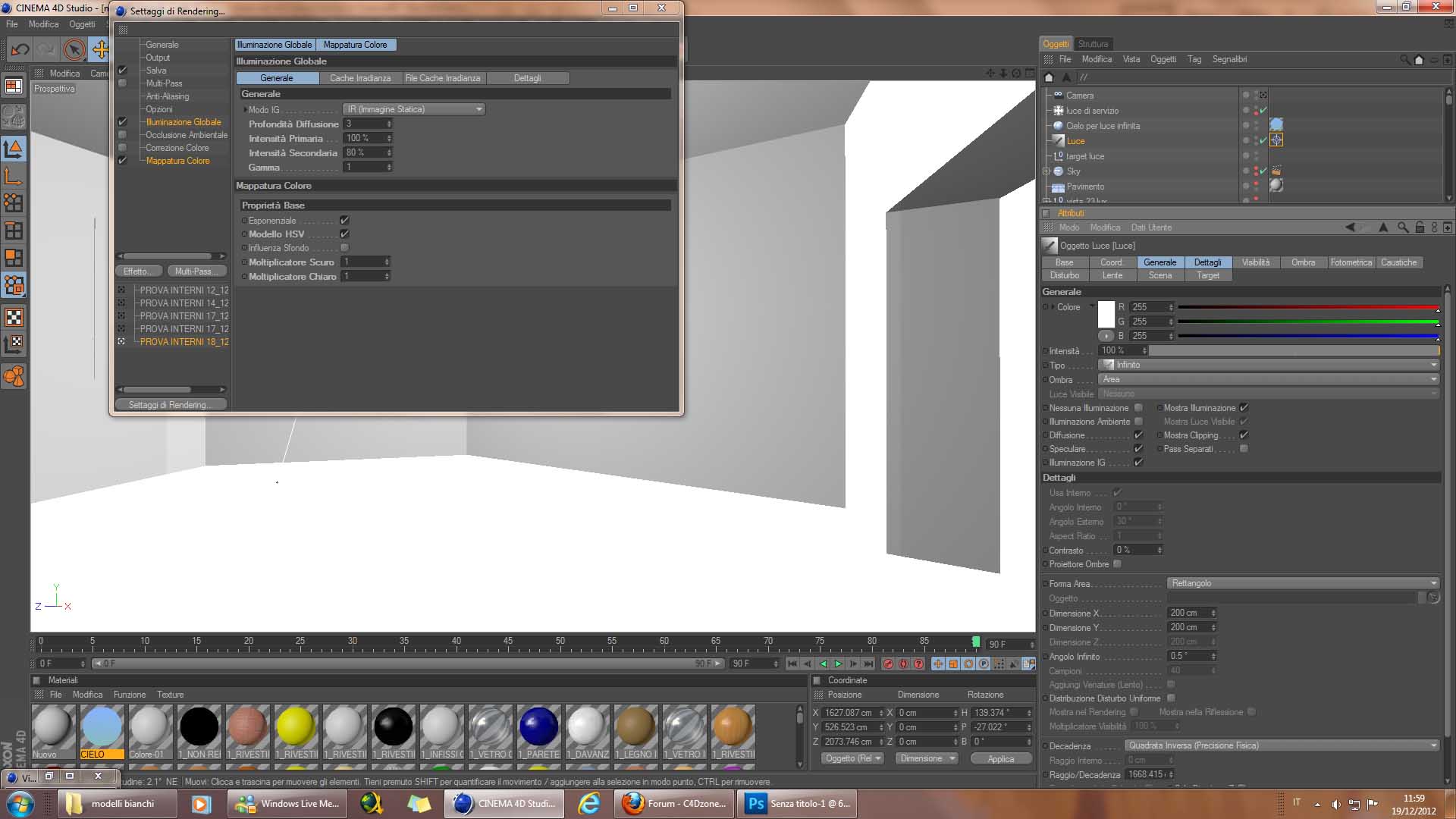 Ho modificato l'impostazione della luce area...spero vada bene : avevo calcato su GI e sole + cielo perche', gironzolando sui vari forum, m'era parso che le indicazioni che si davano erano quelle di mantenere le luci area attorno al 10-30% mentre i valori di Gi venivano ad attestarsi su grandezze molto maggiori (450, 500...cosi' come per sole e cielo).FofoC4D wrote:Allora, la finestra devi metterla all'esterno, appoggiata leggermente al muro, con l'asse blu (come dice sott) rivolto dentro, il rettangolo deve coprire il buco del muro insomma senza entrarci dentro....