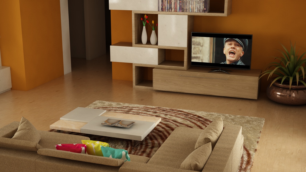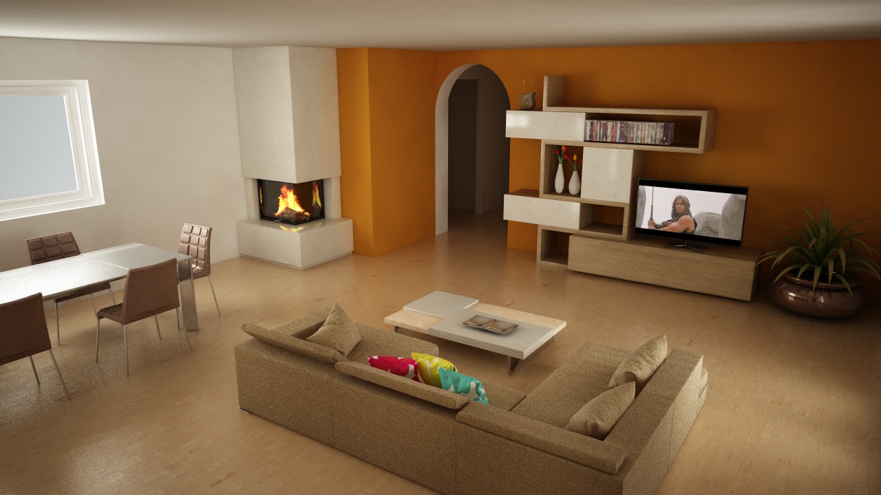 Ecco un altro render, ho messo il tavolo tra il divano e la tv solo per risaltare meglio i materiali del tavolo e le sedie (che sotto la finestra risultavano troppo esposti e i materiali non rendevano, e poi ho inserito un leggero DOF.