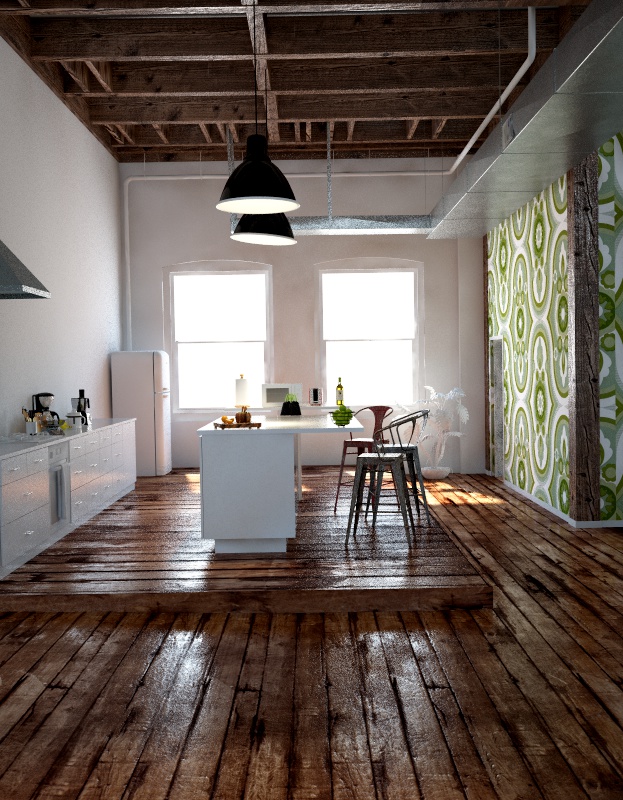 Così ad occhio mi pare che la tex del pavimento sia fuori scala. In particolare le fughe tra i listoni sono eccessive così come il bump. I mattoni sono anch'essi troppo piccoli. I mobili della cucina al contrario sono troppo "piatti" e schiacciati sulla parete. La parete sulla destra deve essere più lucida e riflettere per prendere corpo. L'elemento verticale sullo spigolo ha le venature fuori scala.