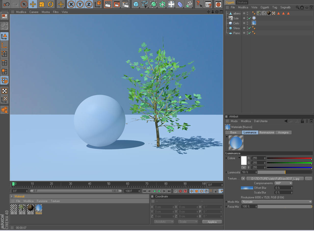 E le uniche luci saranno date dal sole (con la sua relativa ombra) e dal materiale applicato al cielo...(per il cielo sto provando ad usare un "materiale" fresnel invece che una texture)