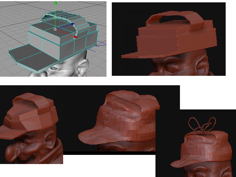 Mah... Mat mi sto approcciando a questo programma con tutta l'umiltà e il rispetto possibile, vado a piccoli passi ma ben fermi. Sto acquistando velocità e dimestichezza e in più sto sfruttando appieno le potenzialità della mia intuos che prima era usata quasi esclusivamente per apporre le firme. Apprezzo molto il consiglio sulla divisione della mesh ma paradossalmente gli unici due consigli che ho ricevuto sono il tuo e uno del Ryo. Eppure sto postando anche sul sito dedicato. I commenti sono i soliti, bravo... mi piace ... ecc ecc ma non ricevo dritte e consigli e tanto per cambiare devo fare tutto da me imparando dai miei errori. Sto aumentando l'interazione tra cinema e zbrush, passando il file da uno all'altro (almeno quando è a basso numero di poligoni) per migliorare la resa e diminuire gli errori nella mesh. Ti mostro come ho approcciato il cappello passando da un programma all'altro e la resa finale (i passaggi di ottimizzazione sono omessi)