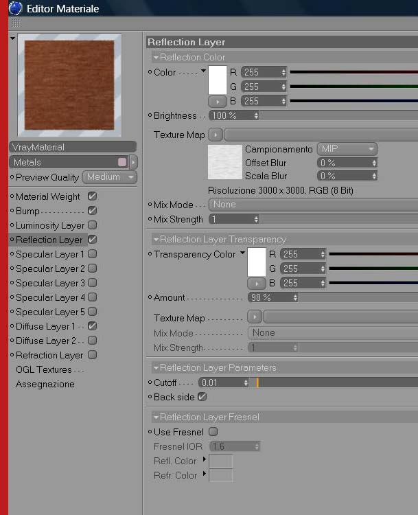 Ciao Ettore ho provato a settare i parametri ma sicuramente sbaglio qualcosa... ora ti posto i parametri del materiale... non so dove va messo quello 0.7 e 0.85... che intendi dire attivata solo la riflessione? che tutto il resto va portato a zero?