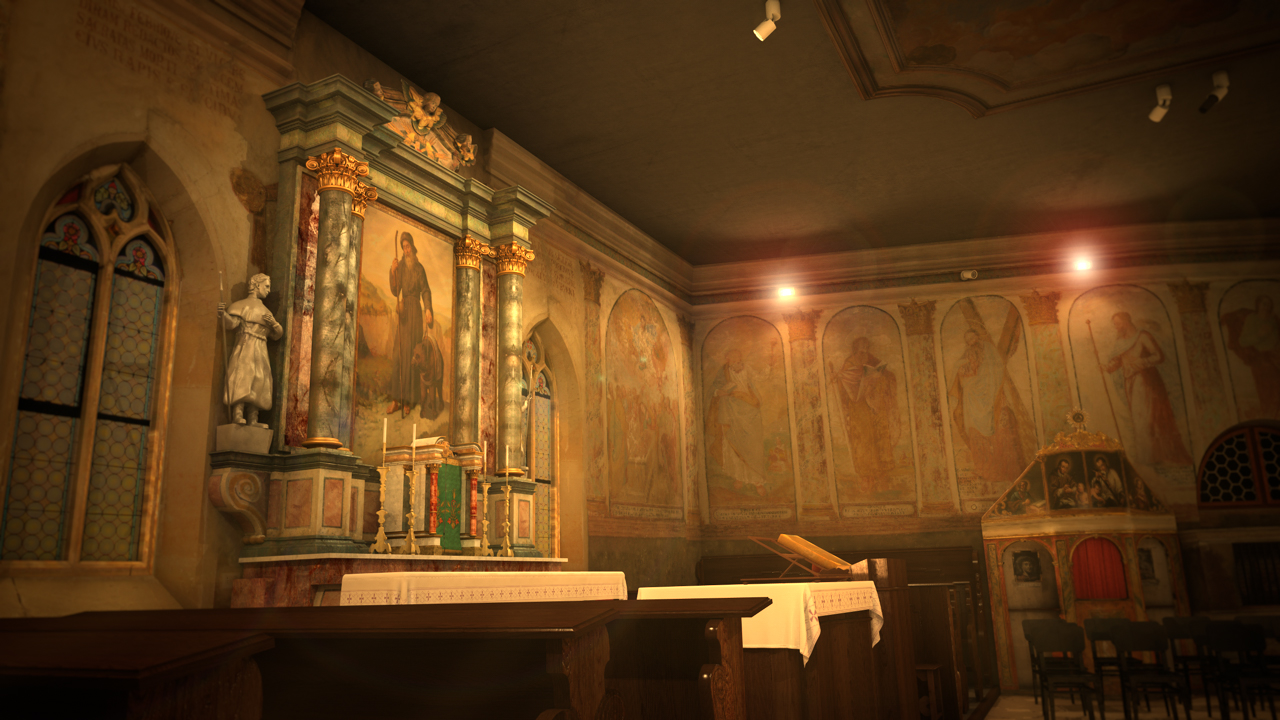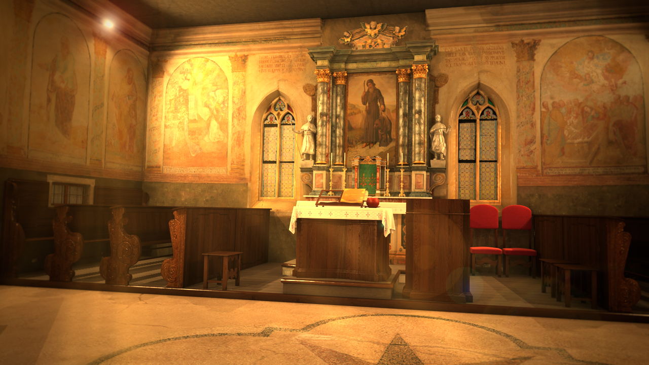 La luce che entra dalle finestra rende molto bene l'idea, le texture del pavimento, delle pareti,.. veramente ben rese. (A mio avviso quelle delle sedie un po' troppo riflettenti).
