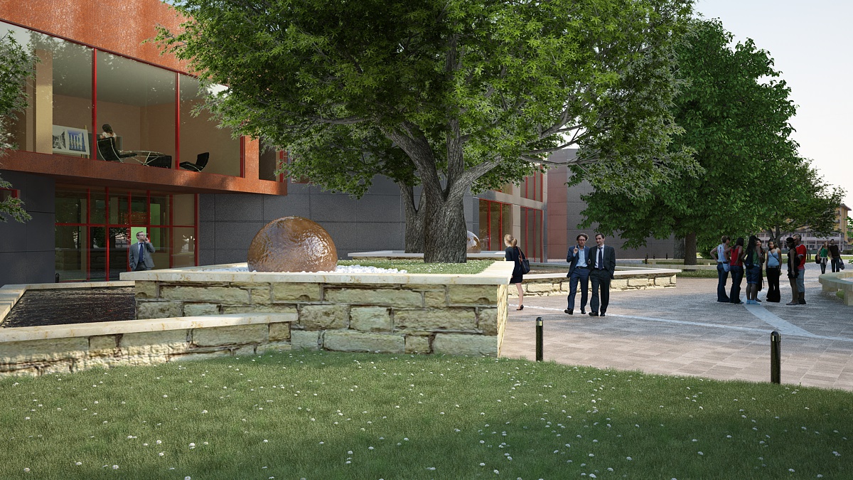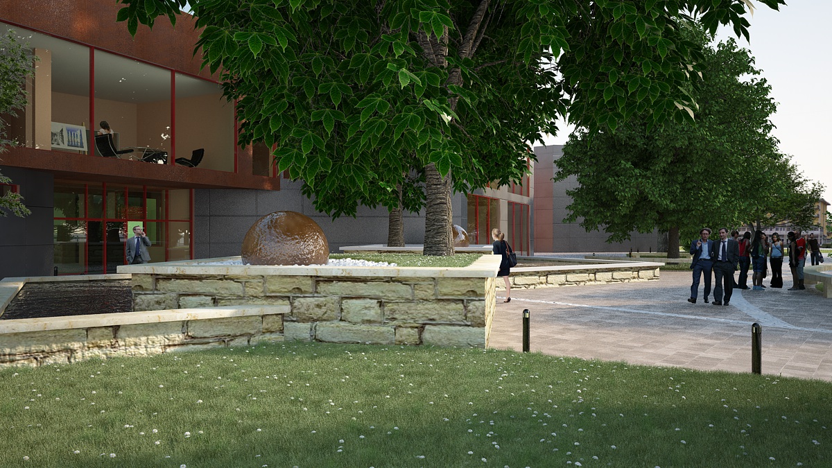ho rivisto un attimo l'aiuola inserendo del ciottolato con una fontana ornamentale composta dal una superficie sferica sulla quale scivola dell'acqua...l'acqua scivola stra i ciottoli e viene raccolta sotto di essa per essere scaricata nella vasca sottostante (a cascata), ma ovviamente questo dettaglio non si vede nella vista