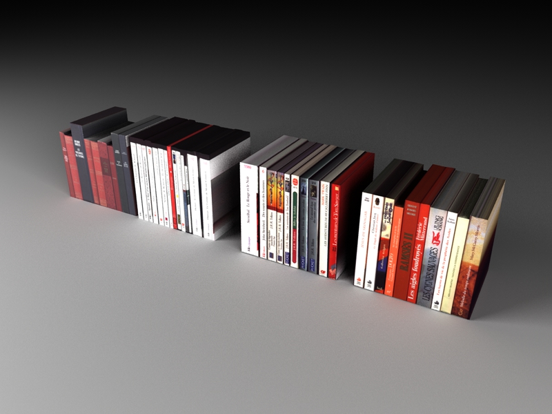 ho provato un render di quel metodo a 300 dpi x vederlo bene...non è proprio come avere i libri, la differenza si vede, ma se anzichè estrudere semplicemente una spline, si modella bene l'ingombro e qualche divisione nei libri, in modo da estruderli in avanti anche, il risultato viene carino...considerando il poco impiego di tempo per queste operazioni a questo punto si possono anche mappare le 3 facce rimanenti, oltre la frontale in cui ci sono tutti i dorsi dei libri, quella superiore con le pagine e quelle ai fianchi con le 2 copertine..volendo il metodo è abbastanza veloce, nel giro di un oretta secondo me ci si toglie dalle balle una bella libreria colma di libri