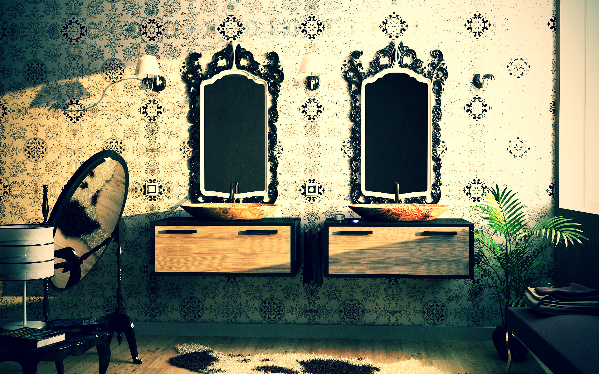 Buona la soluzione del doppio specchio ma cercherei un modello con una cornice più importante e magari color oro "rovinato"... per i lavabi opterei per due console a due gambe con singolo lavabo... struttura barocca laccata nera e lavabo in appoggiato in marmo bianco lucido con rubinetterie oro in tinta con la cornice... e ciliegina sulla torta invece di lampade con paralume opterei per delle lampade a parete con cristalli pendenti :!: ... infine eviterei la solita pianta ormai vista e rivista... curerei maggiormente la finestra con l'aggiunto di una banchina possibilmente in marmo bianco per richiamare i lavabi... ma non la solita banchina rettangolare :roll: ... sulla destra userei una "panca" sempre in stile barocco nero lucida su cui appoggiare i panni... e sulla sinistra essendo in un bagno sostituirei il tutto con una bella vasca da bagno classica alla francese con piedini in oro e rubinetterie in sempre in oro... :arrow: ... sul pavimento proverei a modellare un asciugamano morbido morbido invece del tappeto "animale" un po troppo country... ;) ... Tema finito... 8-)