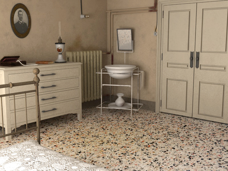 ci sono solo 3 cose che correggerei : la cornice della foto che sembra troppo piatta..ma forse dipende dal materiale; lo spazio sotto la porta...sembra un po troppo sollevata, e sicuri della doppia maniglia?... ultima osservazione sull'angolo bruciato della coperta ricamata..la scena non sembra così illuminata da meritare una bruciatura così evidente...