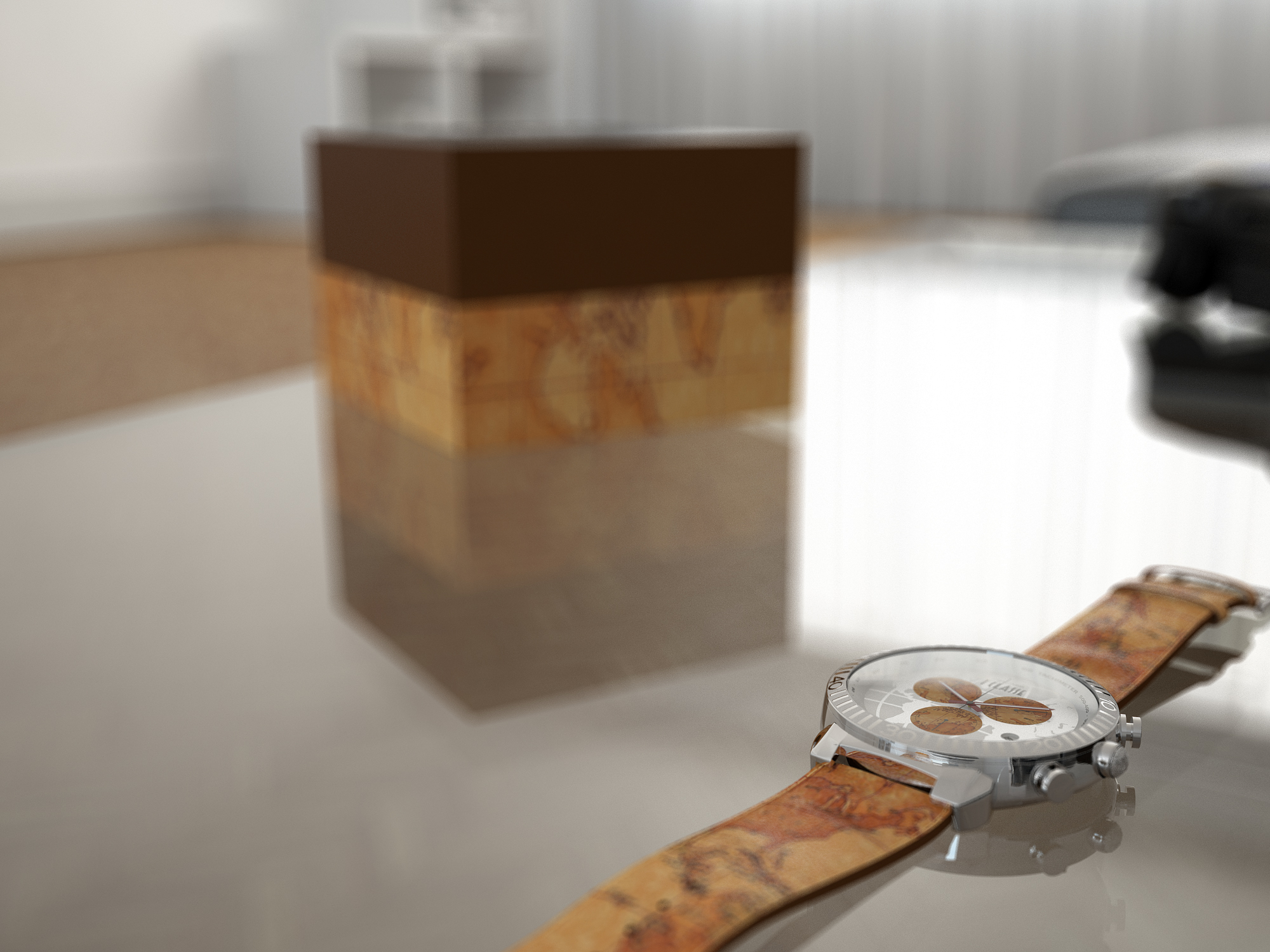 se posso dire la mia, metterei a fuoco orologio e sacatola in quanto fanno parte dell'oggetto principale da rappresentare.