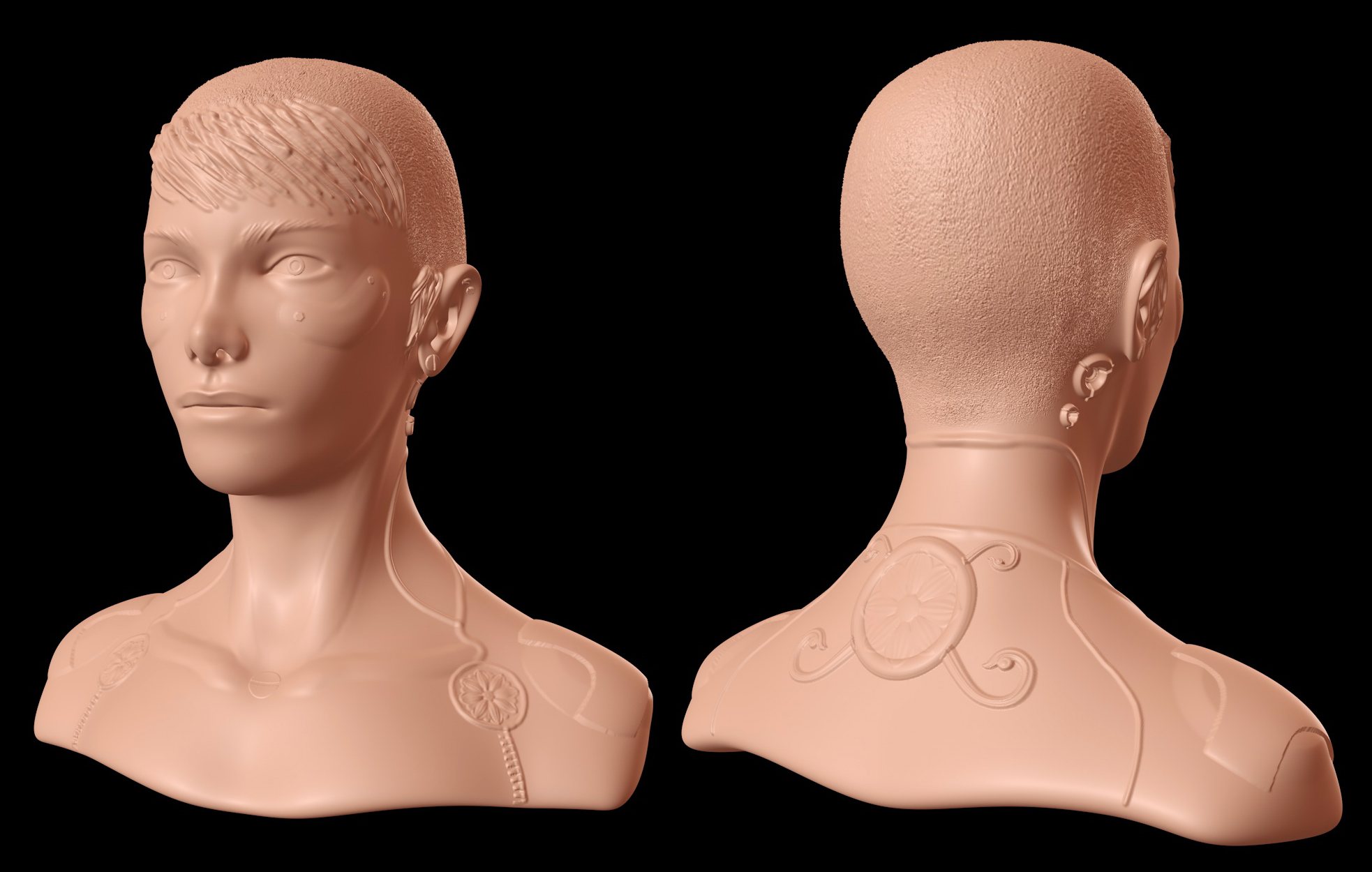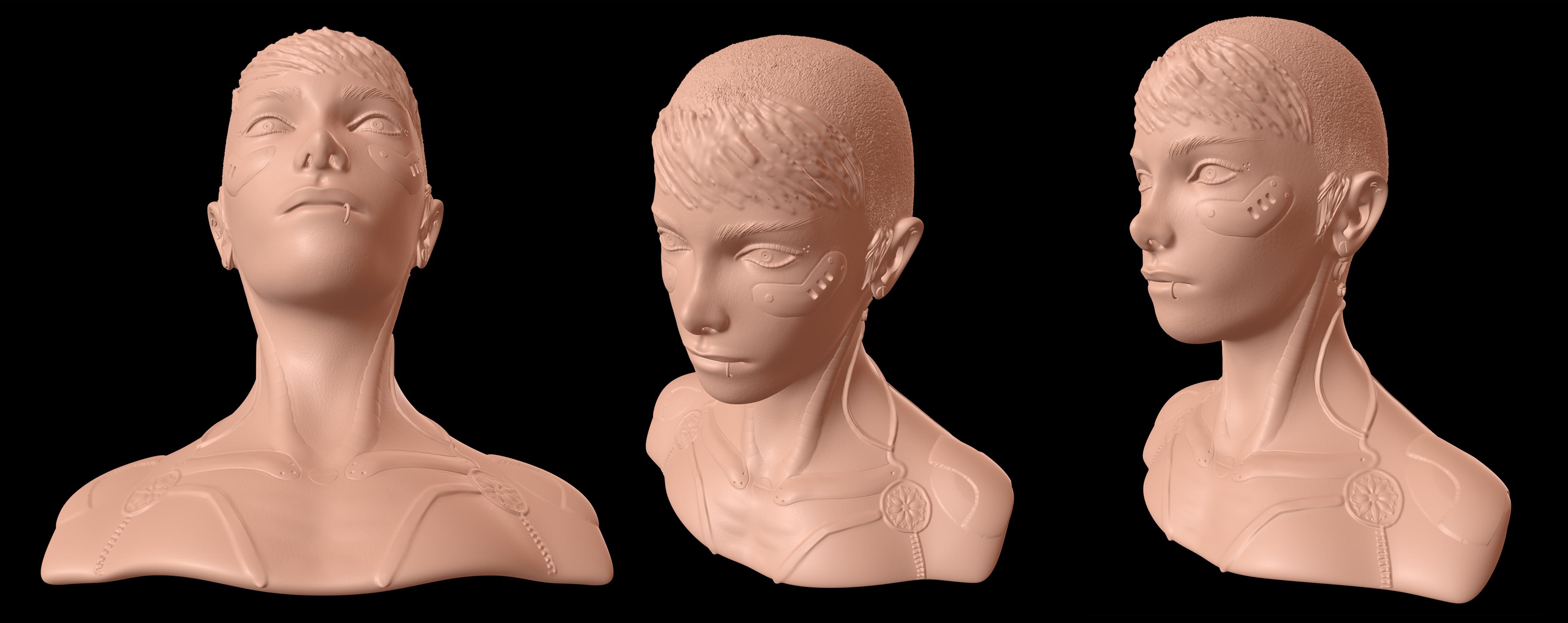 arieccomi, alla fine, proprio per quanto detto nel post immediatamente qui sopra, ho fatto un piccolo test su una delle teste messe a disposizione dai preset dello sculpting, questo è il risultato con un pò di uso di pennelli decorativi e tanti riferimenti all'immaginario cyberpunk.