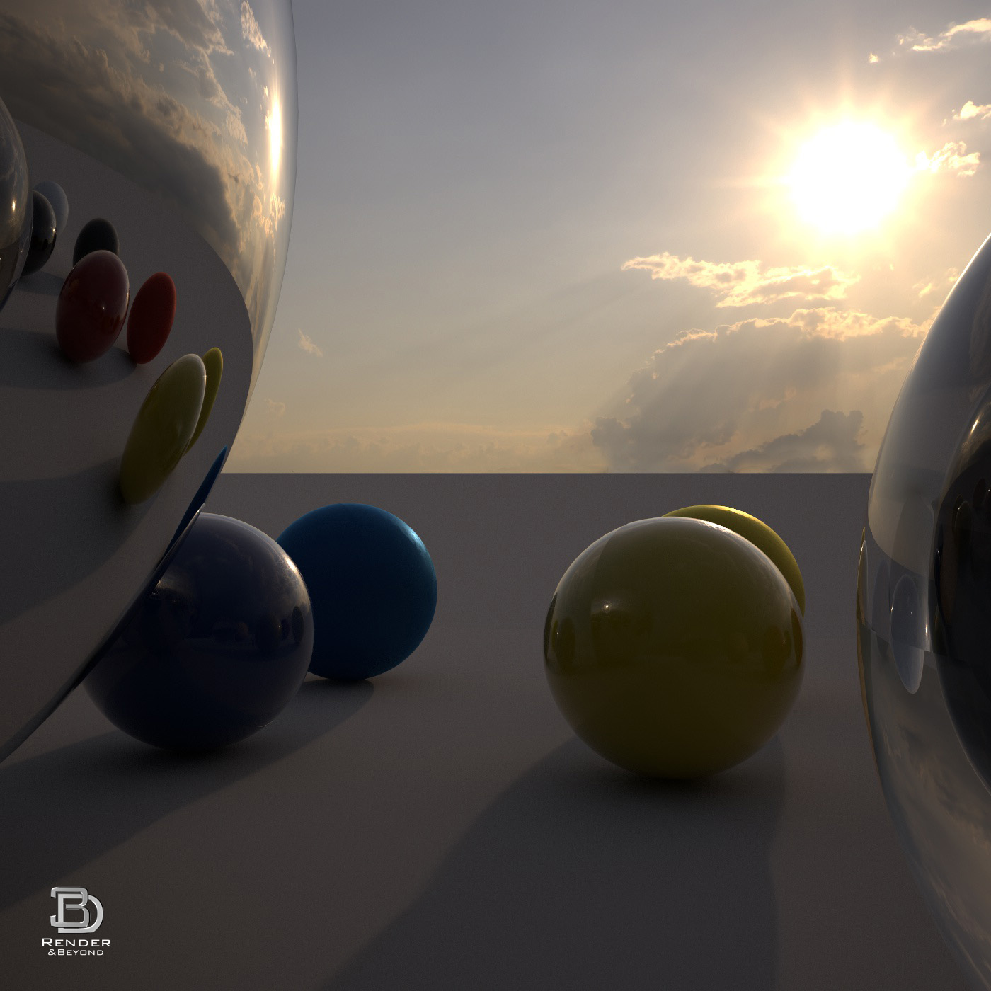 Un po' di giorni fa abbiamo approfittato di qualche nuvola per catturare un cielo decisamente più "drammatico" rispetto ai primi tentativi. Sole basso, quasi al tramonto, e cielo cupo alle spalle. Nel frattempo ho acquistato degli oggetti campione da usare come riferimento per calibrare correttamente le HDR, una sfera cromata da 20cm, sfere legno e vetro circa 10cm e qualche sfera vuota di plastica lucida colorata da 5cm(l'aspetto attuale è leggermente diverso rispetto alla foto in quanto le ho riempite di gesso per evitare l'SSS, che in questa fase mi sembrava superfluo e fuorviante), ho anche "sabbiato" a mano altre sfere identiche con carta abrasiva finissima per averne una versione in plastica opaca anziché lucida. Modellata la geometria ho acquisito con uno spettrofotometro i colori delle sfere da usare nel canale diffuse, ho riprodotto abbastanza accuratamente gli shaders(c'è ancora qualcosa da sistemare) e ho testato subito la scena di riferimento con l'ultima HDR prodotta.