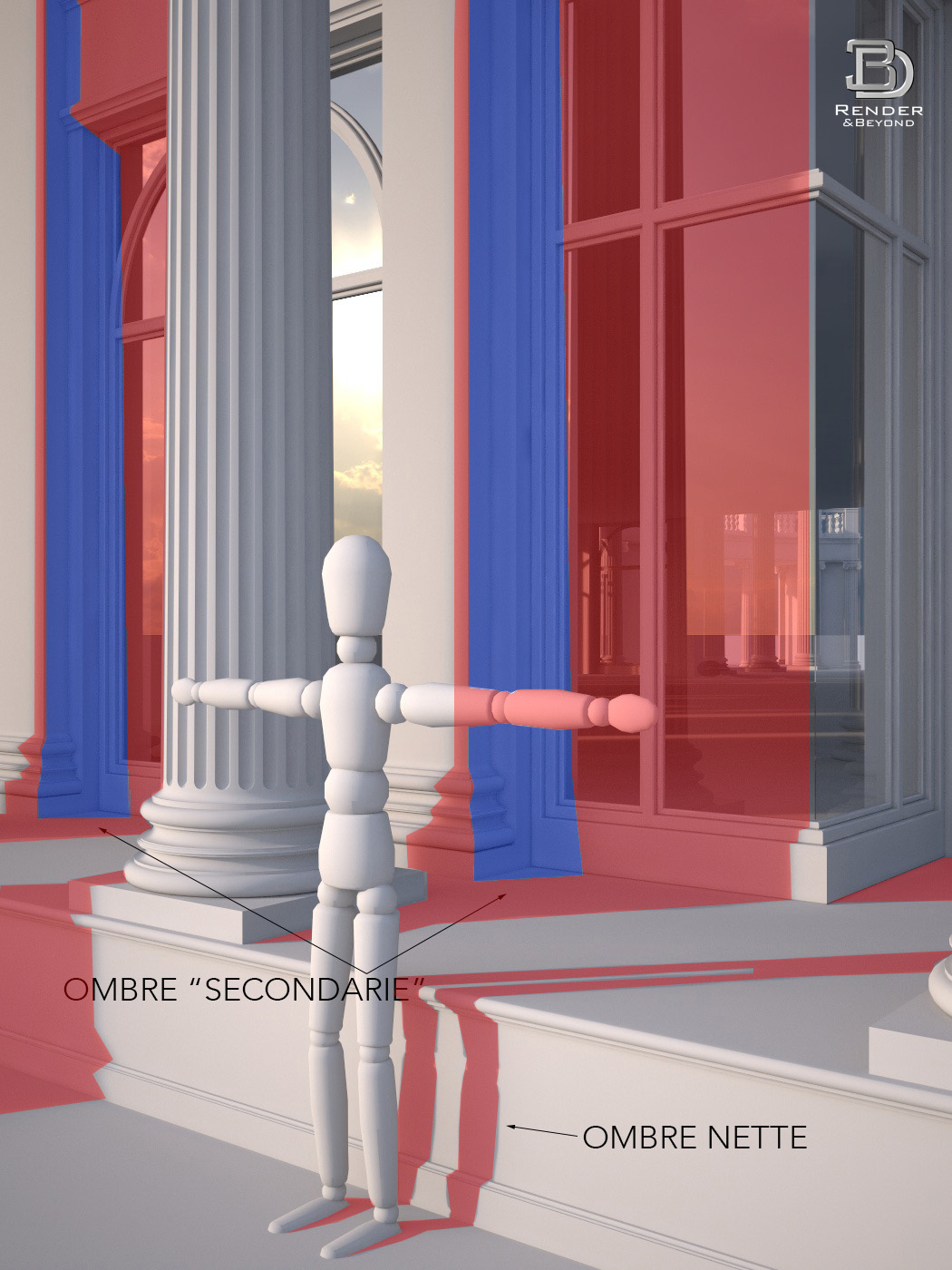 per ombra secondaria intendevo l'ulteriore ombra portata(molto sfumata e appena percettibile) che si va a creare all'interno del''ombra primaria portata dal sole(allego immagine, rosso primaria, blu secondaria), questa seconda ombra è generata solamente dall'energia della volta celeste dell'HDR e in particolare dalle zone più illuminate del cielo adiacenti al sole, un physical sun/sky non ha per ovvi motivi tutta questa energia e pertanto l'ombra risulterà molto più piatta.