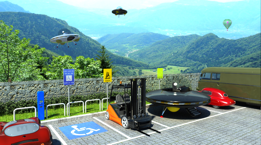 Potresti mettere una vettura che ha parcheggiato nel posto riservato al muletto e quest'ultimo che la sta sollevando per liberarsi il parcheggio ... anche se mi sa che una cosa del genere la dovresti risolvere con due o tre render in stile "striscia comics" ... tra i miei sogni nel cassetto c'è quello di un fumetto in 3D, quindi il consiglio rimane.