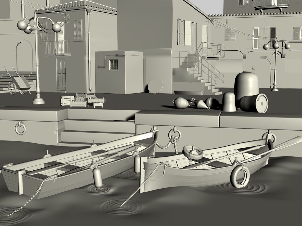 Ridefinite barche con aggiunte di particolari vari, fatta cura dimagrante di alcune migliaia di poligoni agli oggetti che magari ora hanno una mesh non molto pulita nelle parti che non si vedono ma mi importa poco e fatte altre prove di illuminazione aggiungendo più luci.