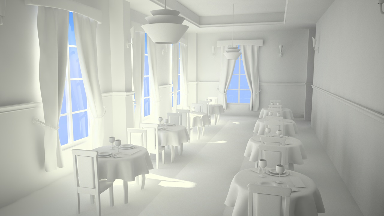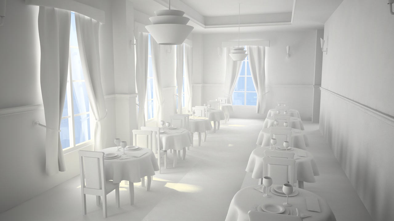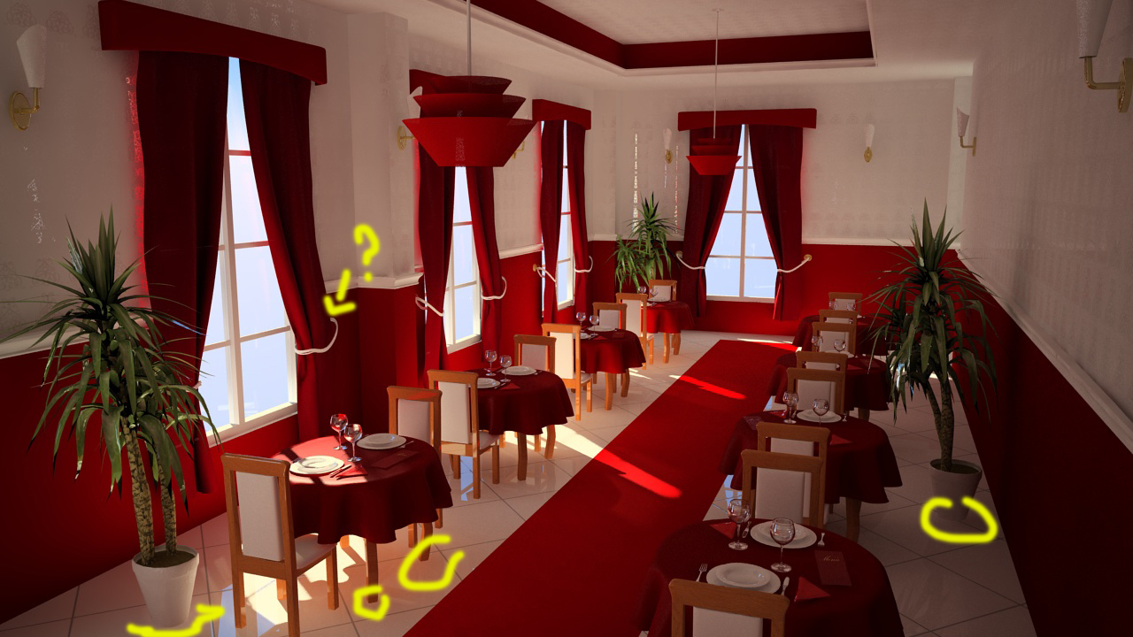 togli i materiali e ricomincia con le luci messe nel punto giusto...tutto quello che poggia sul pavimento sembra nn avere ombre...le piante le diversificherei tra loro, il copia/incolla toglie realismo...idem x tavoli, sedie e mise en place.