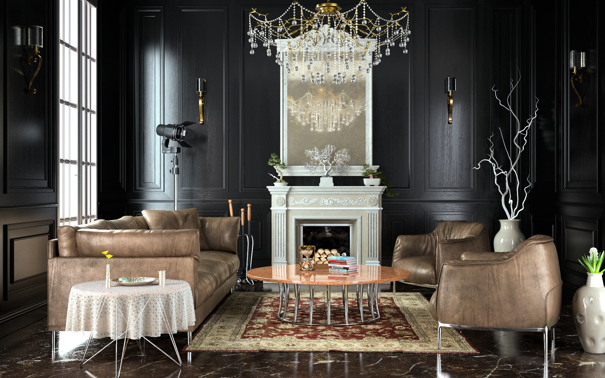 Nell'inquadratura, furbamente, a differenza tua non fa vedere il fondo stanza e il serramento completo. Tutta l'ambientazione si sviluppa sotto finestra. Infatti come si nota, la zona opposta alla finestra è molto buia e la boiserie poco dettagliata.
