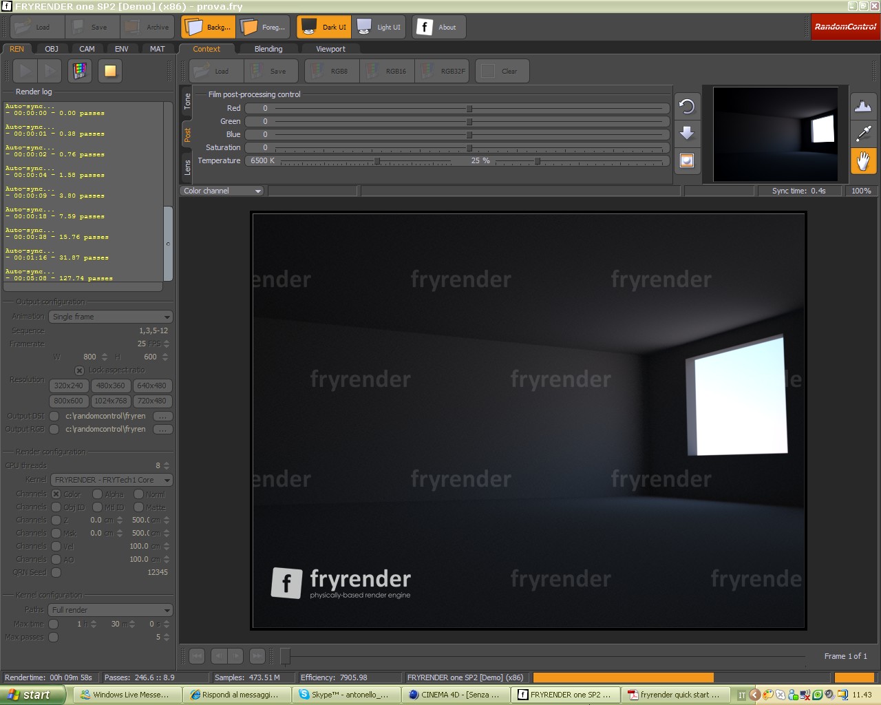 il fatto è che una scena semplicissima l'ho fatta: una stanza con una finestra ed una luce posizionata all'esterno, una camera a cui ho associato il tag fryrender camera, mantendendo tutto di default anche nelle impostazioni di render