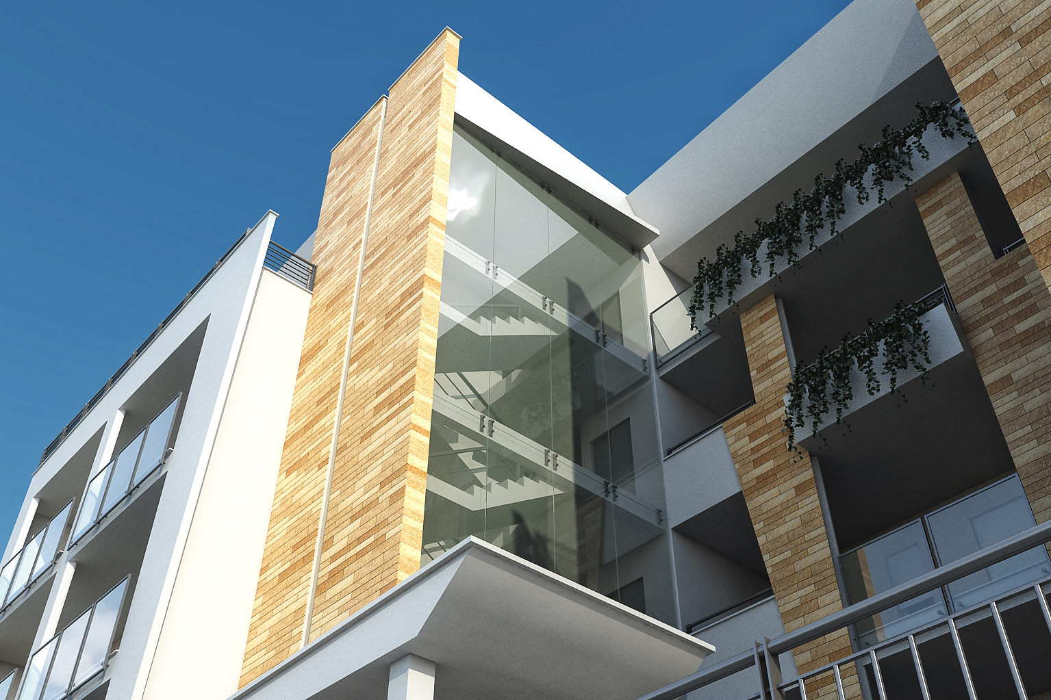 c'è una cosa che non mi graba tantissimo: quelle lastre bianche dei balconi sono di vetro? sembrano molto plasticose, non so, non sono convintissimo [magari è solo il riflesso un po' piatto che mi inganna]. poi in post potete dare un'aggiuntina alle piante sulla porzione centrale del prospetto: secondo me, meriterebbero un po' più di compagnia.