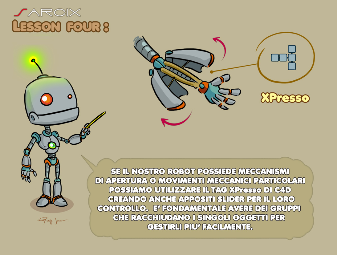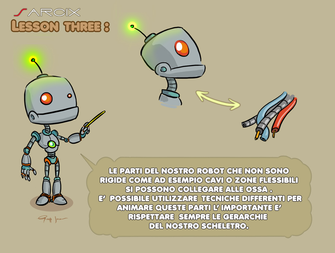 Le parti rigide del robot non vanno collegate ( SKINNATE ) alle ossa, ma vanno inserite al loro interno, così anche se avessi un " avambraccio " del robot pieno di oggetti e particolari, basta raggrupparli ed inserirli dentro l' osso per gestirlo in maniera semplice e veloce.