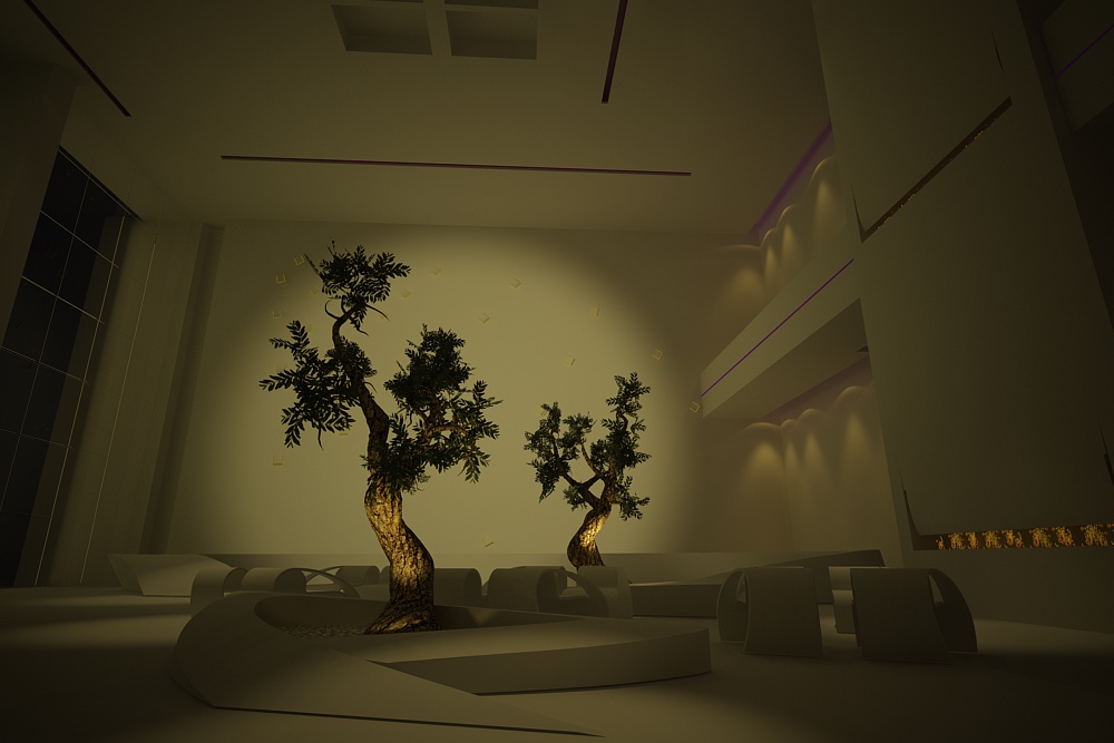 allora...sono nel pallone, ho provato questa scena mille volte, vorrei ottenere una luce tipo quella del render qui sopra, ma non ci riesco...il render sopra ha una luce più bianca nel mio dovrebbe essere più gialla...poi la luce cher vedi è dovuta al proiettore che deve proiettare un'immagine su quella parete...ho pensato di inserirla dopo ma davanti a quella parete ho una tenda di catene e con photoshop nn viene bene...c'è un metodo per inserirla magari dal canale materiale? quella luce spot sulla parete mi appiattisce molto la scena e mi fa sballare la luce generale