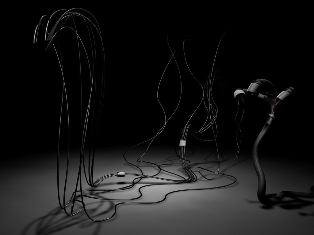 Ora non ho la testa di mettermi sul fondale, giornata stancante, ma posto una prima lavorazione dei cavi ... non mi dispiacerebbe ricoprire quasi interamente il pavimento di matasse, ma così perderei la riflessione che duplica quasi l'intero quadro, cosa che mi piace molto, quindi, forse, non arriverò a tanto ... (il render che viene usato dalla Maxon per il modulo NETrender mi ha sempre fatto impazzire, quello dei pali elettrici, penso che un po' arrivi da lì questa mia volontà).