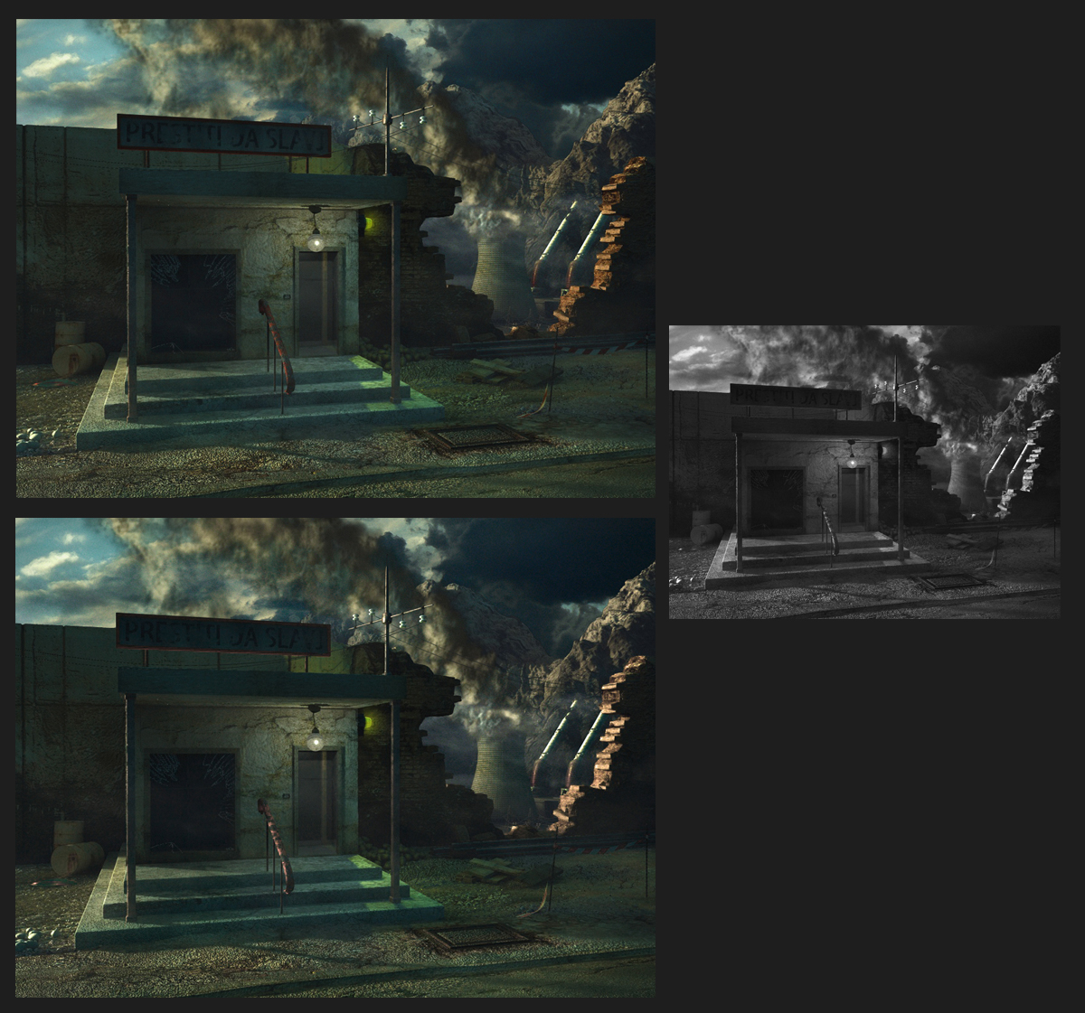... e ho anche fatto una prova di postproduzione sulla vignetta della banca: ho duplicato il livello base, gestito il bianco e nero per ogni canale colore, così da ottenere un contrasto controllato e, infine, usato il risultato per filtrare l'immagine base, composite colore.