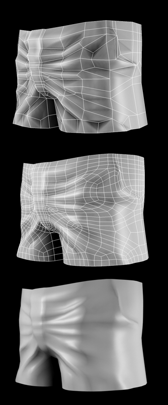 Intanto mi sto dedicando ai vestiti di Garza, più precisamente ai panneggi dei calzoncini ... forse sono riuscito a creare un modello abbastanza ordinato e senza triangoli.
