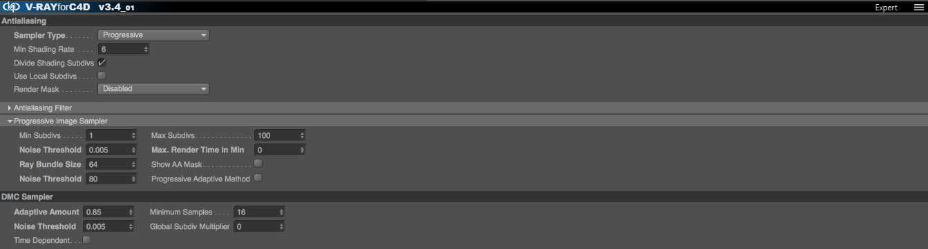 Finora ho capito che con la 3.4 tenendo il Global Subdiv Multiplier a 0 il programma gestisce le suddivisioni in automatico, quindi, col progressive per ridurre il noise devo variare i soli settaggi del AA (probabilmente sbaglio perché dovrei intervenire su altro). Impostando il Max Render Time a 0 ed il noise treshold a 0,001 (che è il minimo che mi consente) e lasciando tutto il resto invariato, quindi DMC 0,85-16-0,005-0, nonostante i settaggi siano alti, credo, ottengo sempre immagini disturbante.