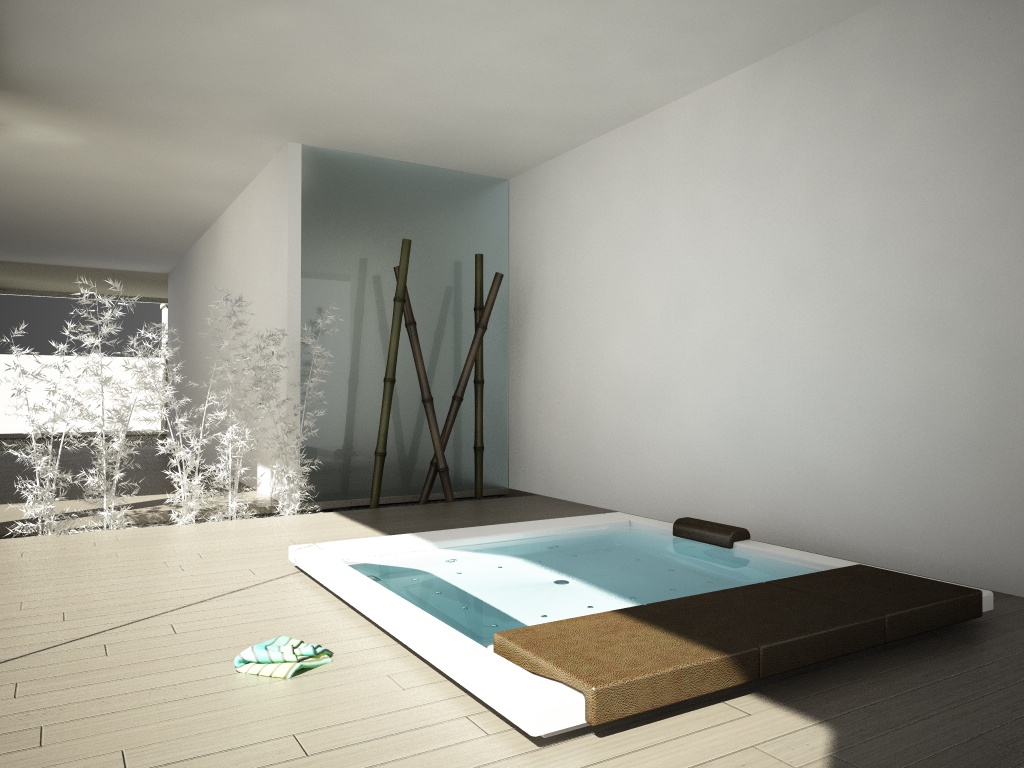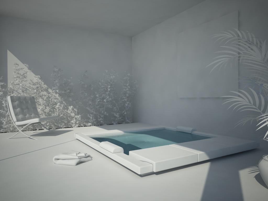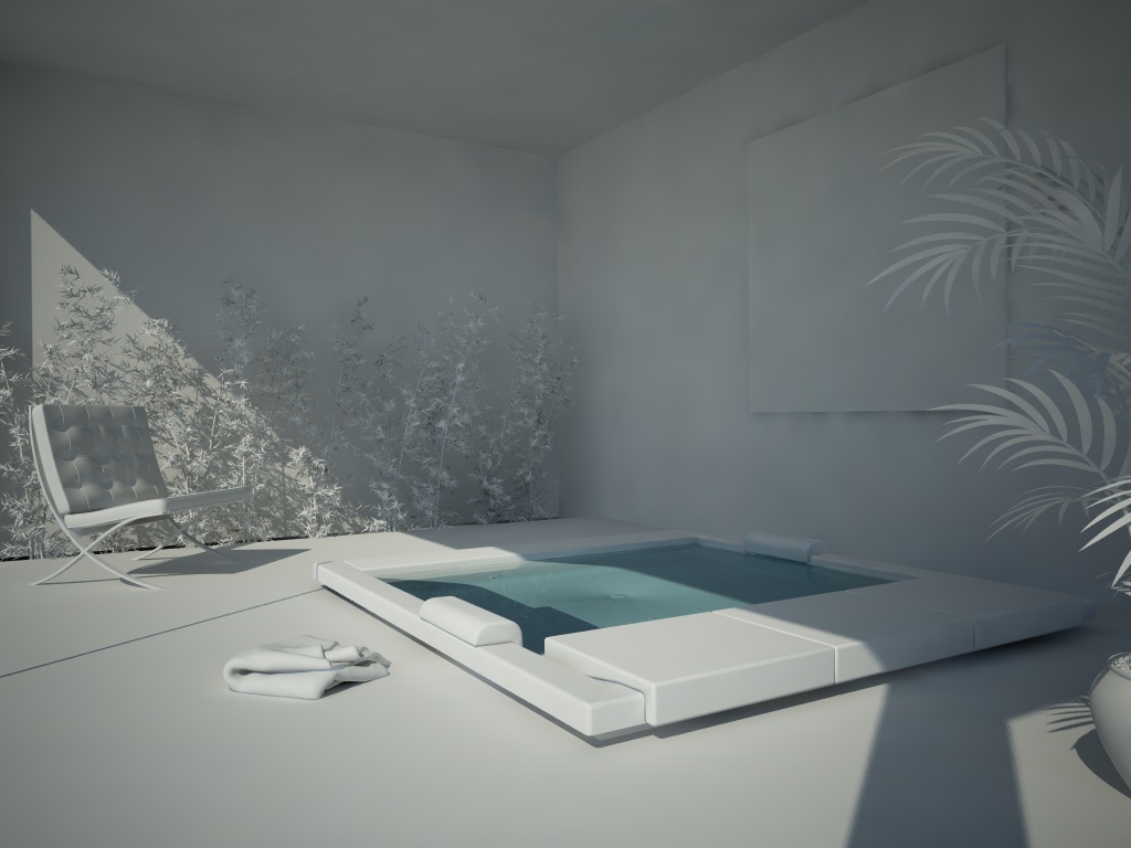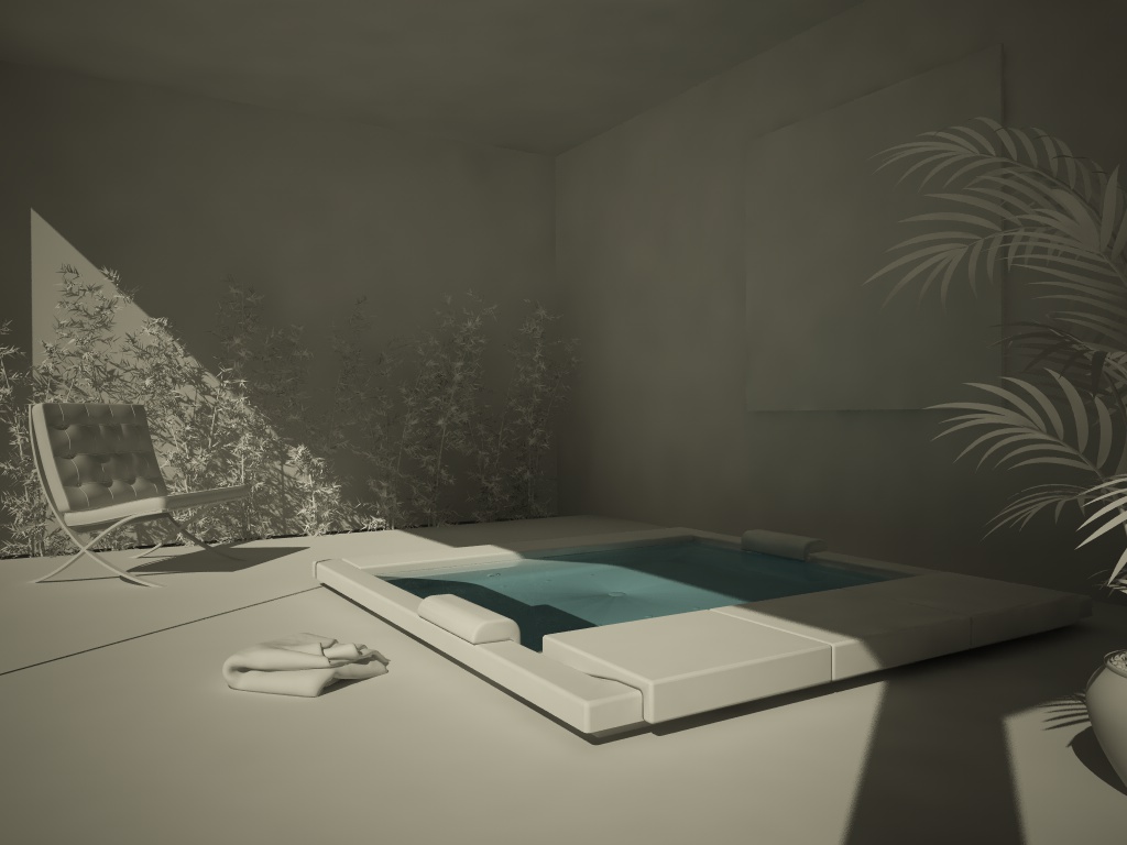 la scena mi sembra un po' troppo bruciata dove agisce il sole sui materiali bianchi...si perdono i controni della vasca (soggetto della scena)