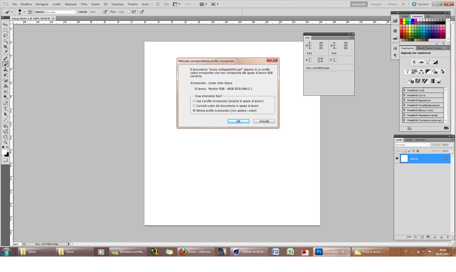 In particolare, nonostante nei settaggi del profilo colore di cinema sia scelto l'srgb, quando apro il file in ps mi dice che l'immagine ha un profilo colore incorporato (lineare) che non corrisponde allo spazio di lavoro.