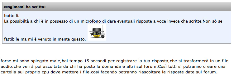 cmq la chatroom la vedevo più per uno scambio di informazioni dirette, o saluti, o avvisi tra utente e utente... e perchè no, anche la nascita di qualche amicizia. Il bello dei forum è anche questo, no?