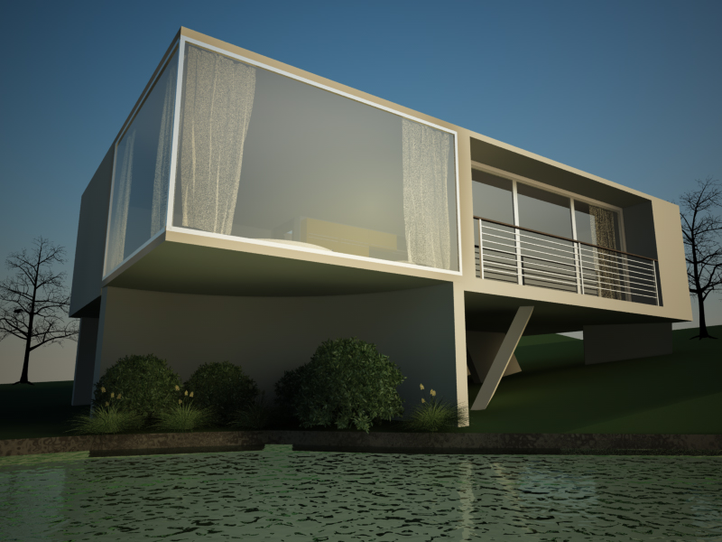 eheh,piccolina la casetta sul lago xD...secondo me dovresti lavorare meglio sui mat,un po troppo semplici ;) sarebbe bello anche un render dell interno secondo me