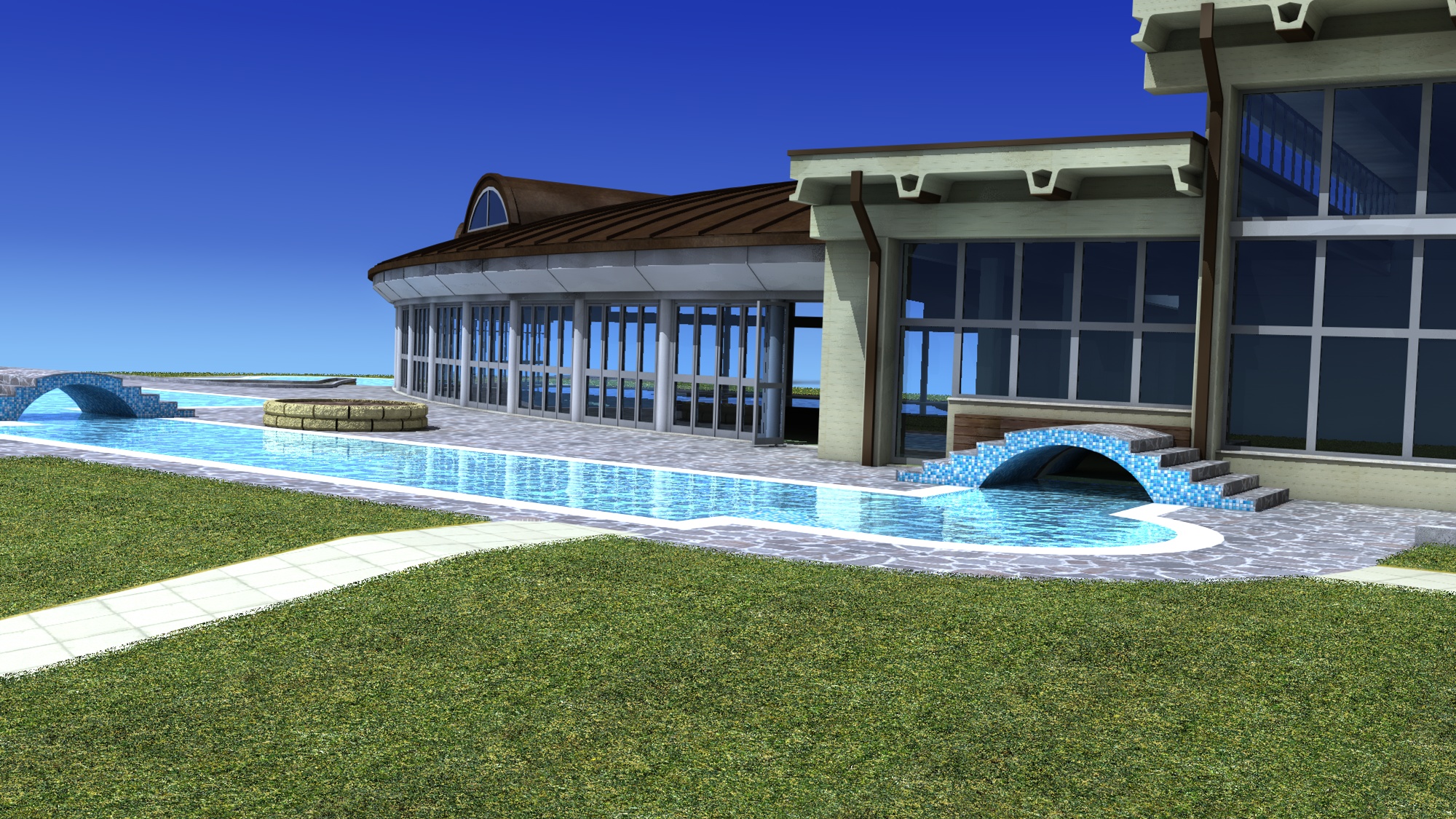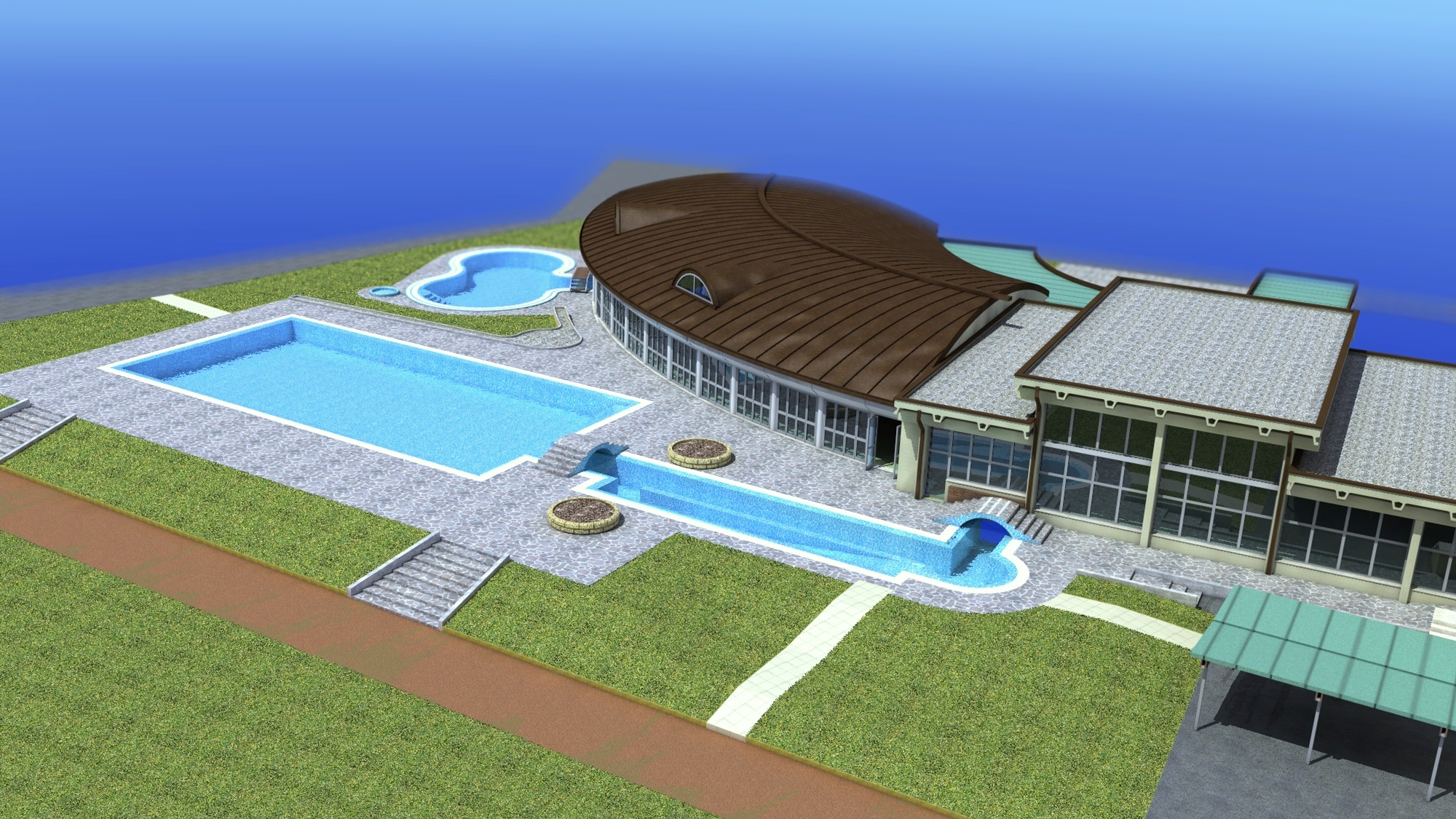 devo rendere "comprensibile" ad un cliente, la copertura di una piscina esistente. attualmente la situazione è come dai primi 2 render , e il successivo è il progetto che vorremmo realizzare. che ve ne pare?