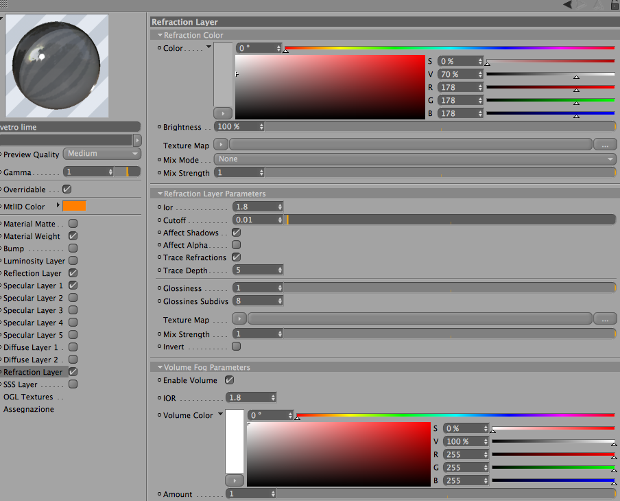 qui nell'editor del materiale, nel pannello refraction