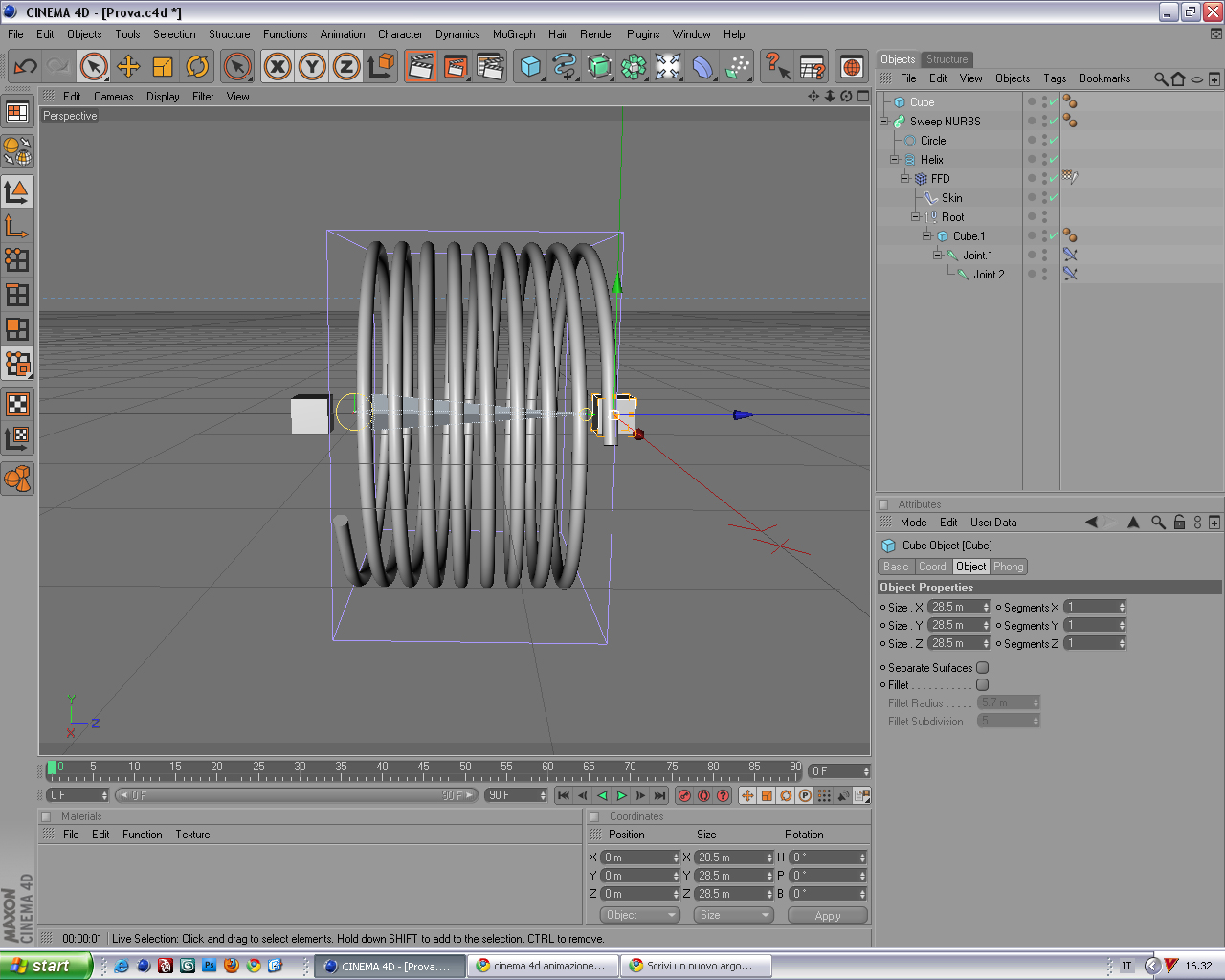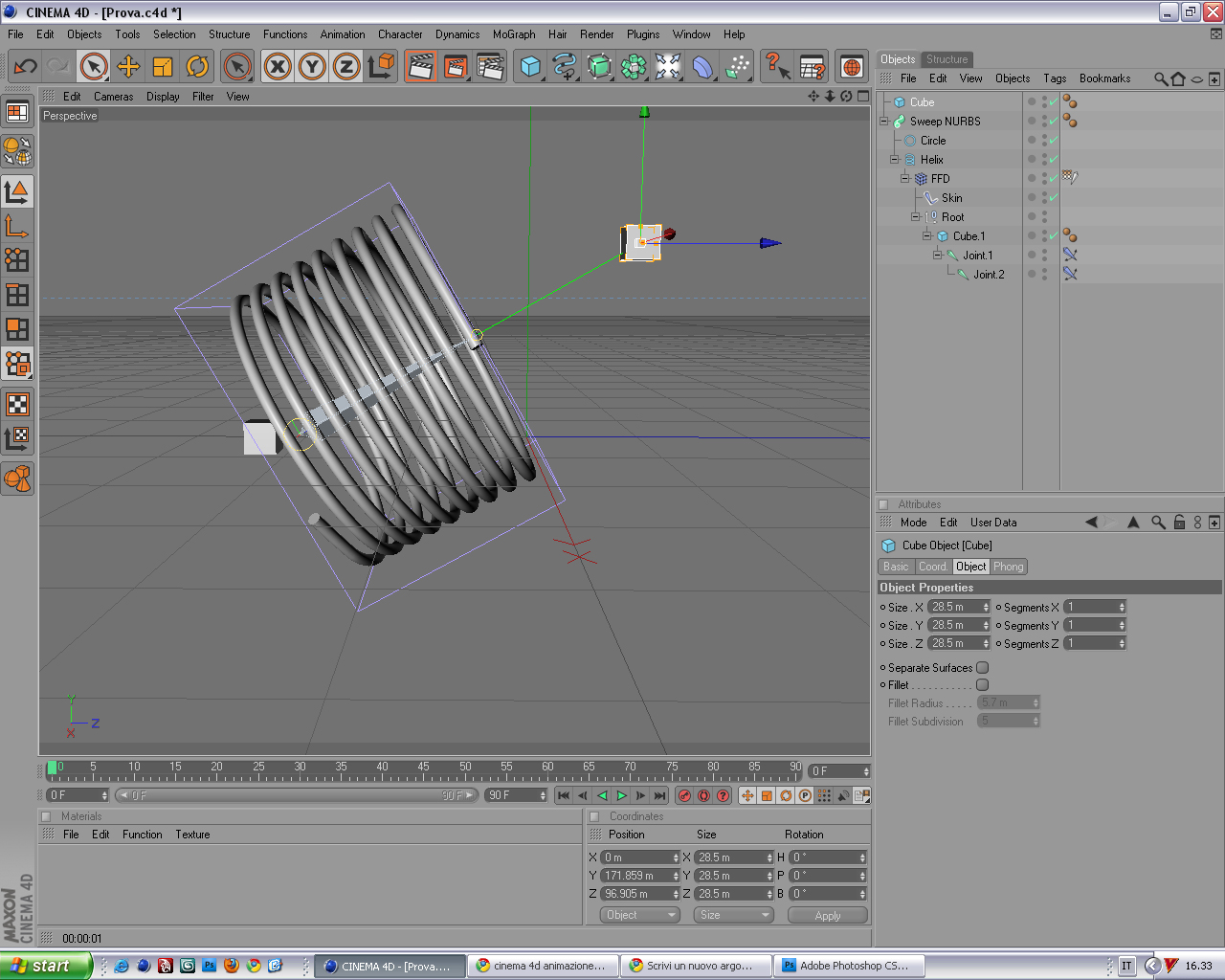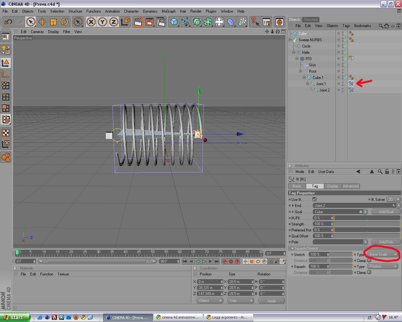 Poi ho riggato con 2 joint il FFD e ho messo un tag IK i joint ed ho messo come GOAL un cubo (quello piccolo a destra)