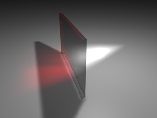 Nell'esempio io ho usato una luce bianca e una del colore del vetro (rosso) creando un duplicato della prima e agendo sul cropping... meglio di niente...