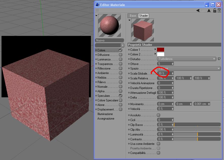 E' la scala globale dello shader. Se ti viene "a puntini" si deve aumentare per avere aree più vaste; se non si vede quasi nulla..diminuire. Se il contrasto è troppo marcato rendi più chiaro il colore del disturbo. Ah! prova non solo il disturbo "disturbo" (!) ma anche ad es. le varie turbolenze che sono più morbide come effetto.