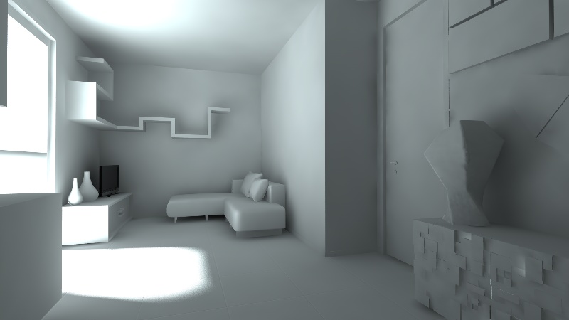 - secondo me hai una sola luce area in questa immagine, vero? Proverei a mettere un'altra area teoricamente dove c'è la porta (aperta) con un'intensità bassa. Se invece la porta deve essere chiusa per tua scelta puoi fingere di far arrivare un po' di luce da dietro la camera anche se in realtà non ci sono nè porte nè finestre.